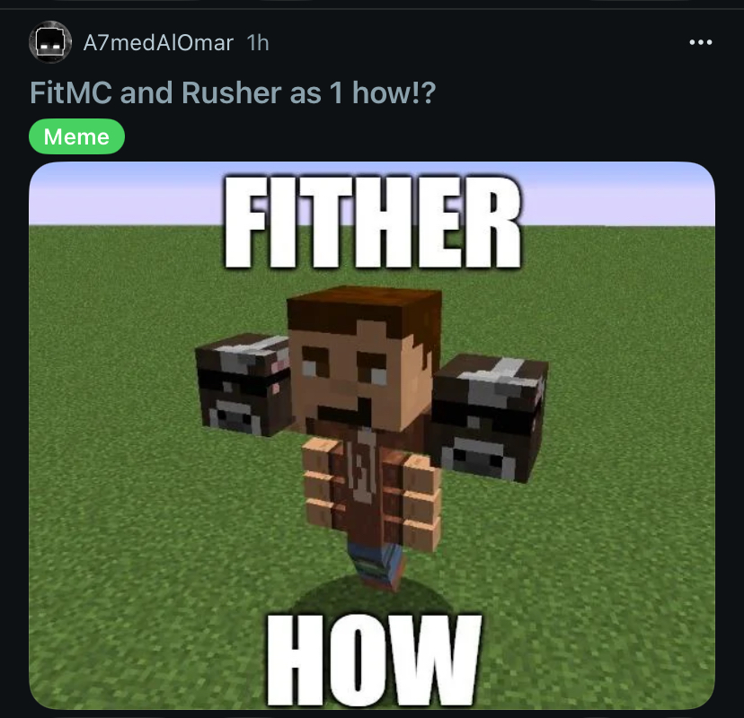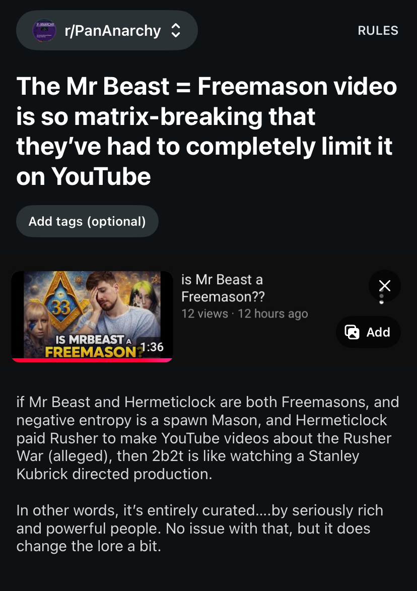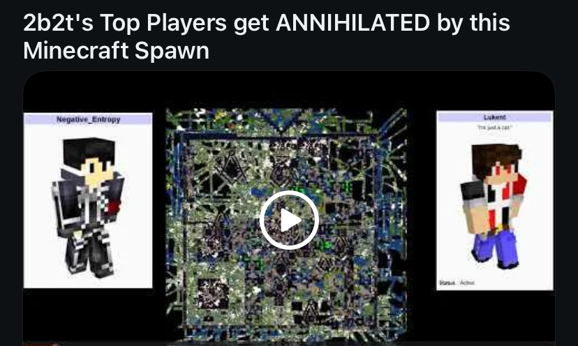 >>2299512NPC alert!“Wahhhh why isn’t the video formatted like every YouTube other video?? CONFORM”Meanwhile, doesn’t address that the Camping Rusher has been admin-ing 2b2t, paywalled his server with time-gated access queue, and (if Old Lady North is to be believed) was elevated algorithmically via the internet/Mr Beast/Freemasons etc2b2t is popular for the the same reason that Taylor Swift is popular. That’s the most interesting part of all this. The story of “2b2t was started by a small group of friends and it grew organically from that” is the same situation with Taylor Swift. Would Taylor Swift be popular without powerful help?Would the Rusher Wars and Fit have gone anywhere without powerful help?We will never know, but we can guess probably not given how hostile the system is to uninitiated outsiders (P-Anarchy).
