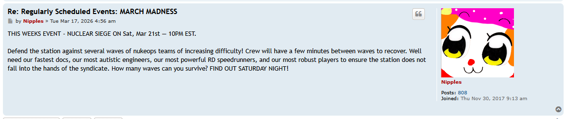 >>2305743Here, go spice up this lolcow threadhttps://ss13.moe/forum/viewtopic.php?f=4&t=7078