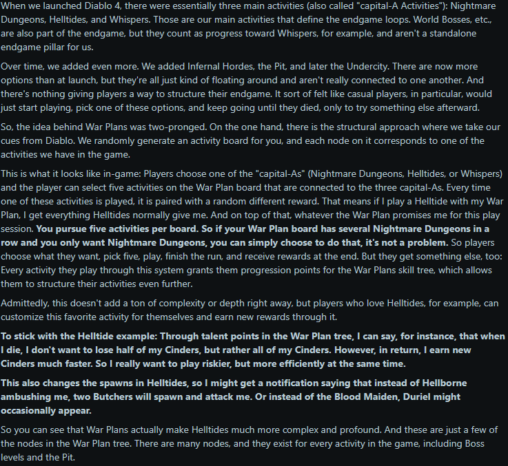 Thing is you have dudes like that Colin or Zaven who seem to know what they are talking about. Former more than the latter imho, but still. Yet very little comes out of that. D4 went through so many iterations that only now it may be looking better and it's only due to making it closer to D3. Which wouldn't be a bad thing if the foundations were at least solid (toughness being removed then added again for instance). Maybe it's the case of too many cooks in the kitchen. I don't really know...