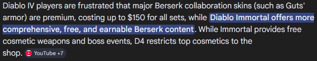 Diablo Immortal gets the same skins/theme events as Diablo 4 except Diablo Immortal gets them for free because IT makes Blizzard money unlike Diablo 4. Blizzard is an American company and American companies only care about short term profits not long term. Yes Diablo 4 MIGHT of sold a decent amount of expansions but they care WAY MORE about how many skins sell between those expansions and when seasons launch broken HALF the time and shit the other HALF people aren't going to show up and or stick around to buy skins. The degree that seasons/classes launch broken in this game is fucking criminal and is ultimately whats going to kill this game before the end of the year.