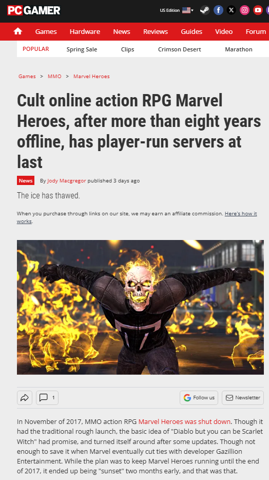 Marvel Heroes Omega, a game that shut down in 2017 has come back by fans. There's 2 private servers. The main one considered by many is Project Tahiti. While the other one is Council of Ancients. Both are good. But CoA is preferred since you don't have to wait an hour to get inside. If anyone doesn't know what this game is, it's Marvel capeshit but as an MMO Diablo clone. If you're into that sorta stuff you'll like it. You have to download the main game. If you have it on Steam you make it a lot easier. If not, I linked the archive download below. But that's what you need to download first. And then you download the server files to login which I also linked.Marvel Heroes 1.52.0.1700 (Omega 2.16a): https://archive.org/details/marvel-heroes-omega-2-16a-steamProject Tahiti: https://mhtahiti.com/Council of Ancients: https://mho.councilofancients.com/