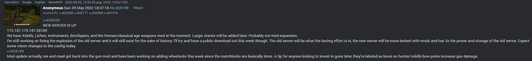>>2329570>ppl dont have meltdowns over itWe had to remove xskills a few years ago when it broke og. The thread outrage was insane when it was threatened to never be reintroduced. Xskills has gliched out during updates and removed levels in the past. Major spergouts.Xskills is actual crack to anons here. I think CO would be the same. Its one of the most unstable mods out there but if added, would become crack to the server that anons could not play without.I think xskills trivializing late game grinding is fine, especially with chiseltools. Late game is civ larp, events, and town building. Most of us have jobs and families. We have no time to grind all the time like we used to.If it were up to me, pog would be 100% vanilla but I know how much it would suck without qol shit like the fruit press, fire, or stacks mods.