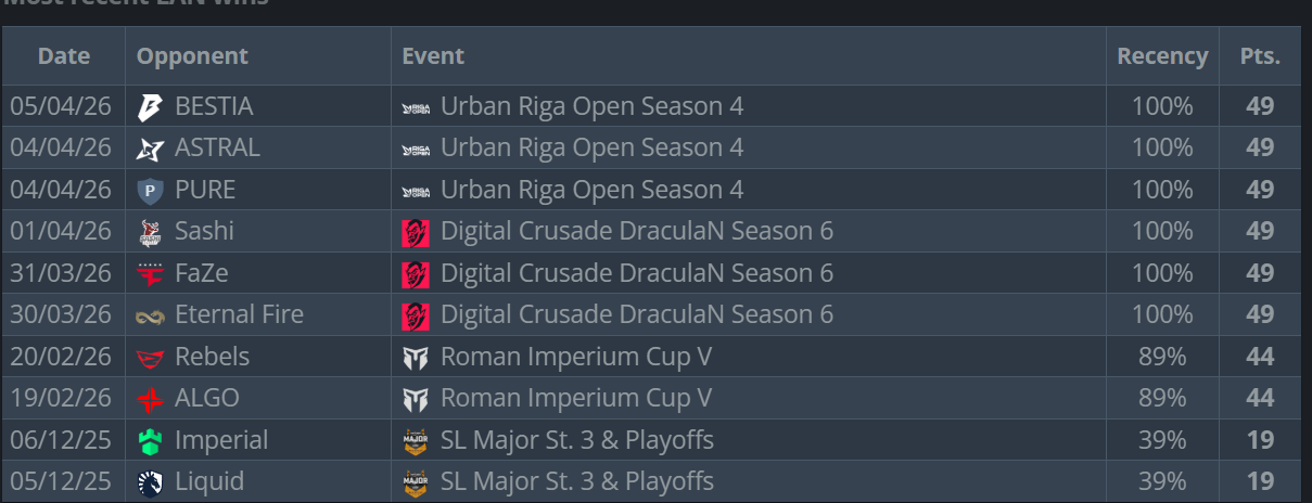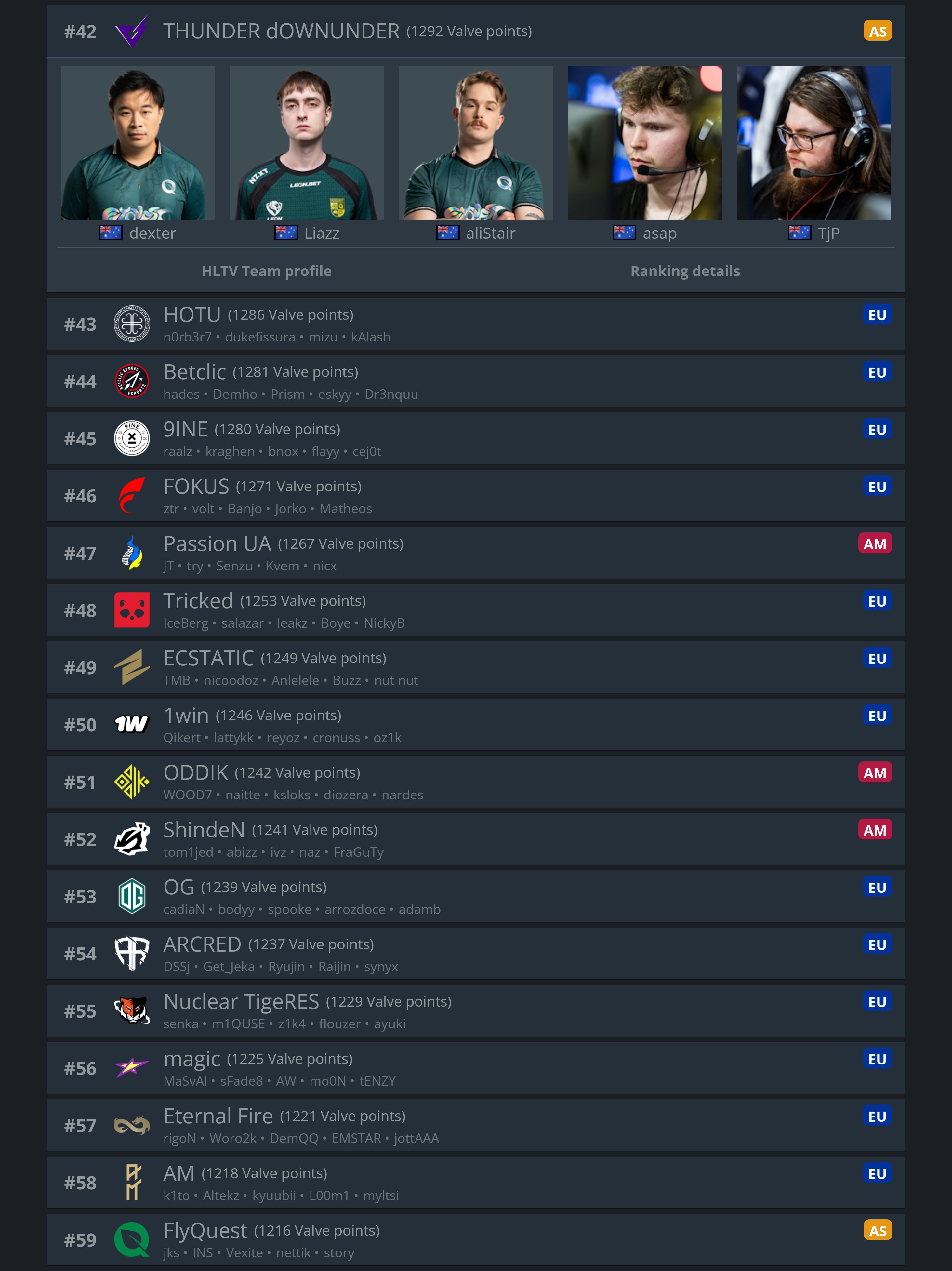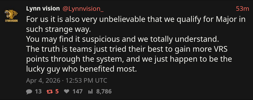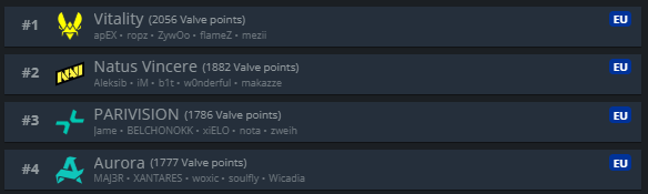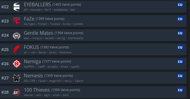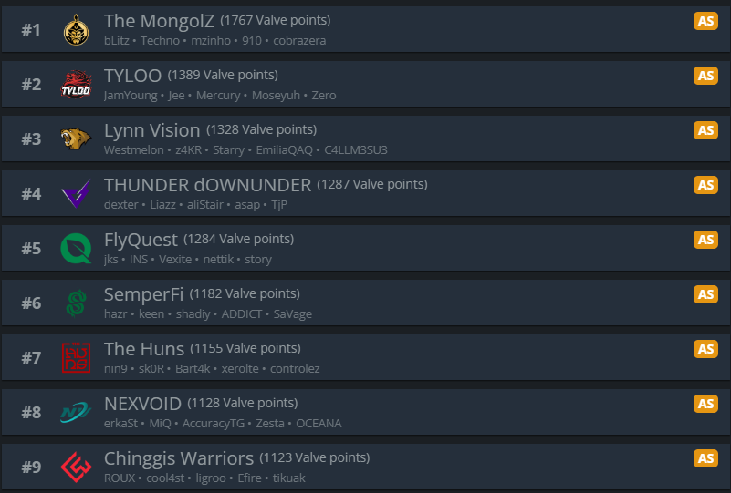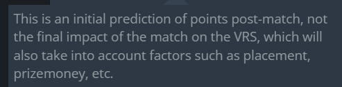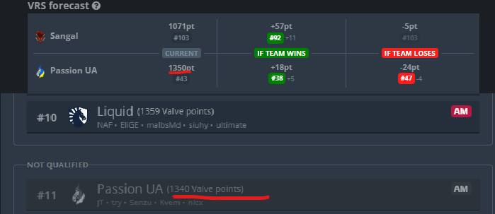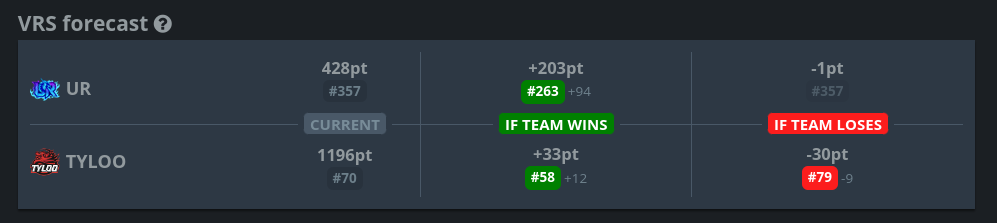 >>2330976this is the VRS after the forfeit wins.they got 45 points from tyloo44 from tyloo again (upper bracket final and grand final)36 from RA for a total of 125so if you take the 125 from their current VRS they would be below FlyQuest and miss the invite. My grasp on VRS is pretty poor and idek if the numbers im getting from HLTV are accurate so maybe im wrong.