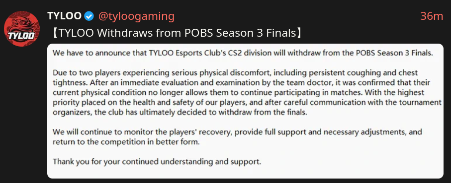 >>2331000If Tyloo's players are too sick to play they should be replaced in the Major by the team who's 6th in the Rest of the World VRS