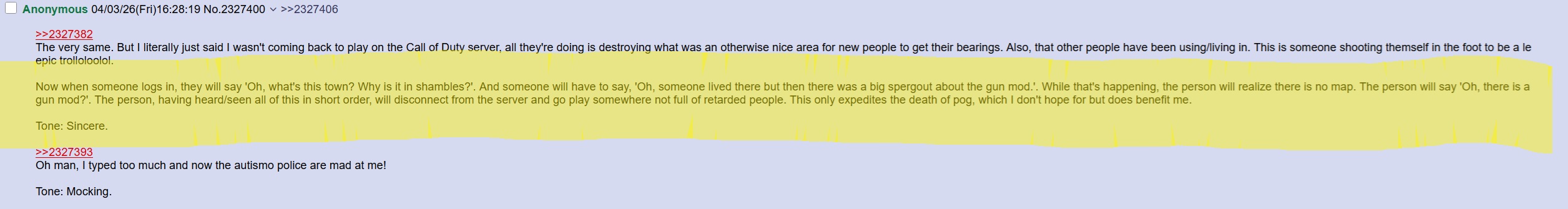 when did you guys become such spergsor is this a case of no IP counters and the thread being spammed by like one or two people pretending to be multiple retards while everyone is squatting on the server