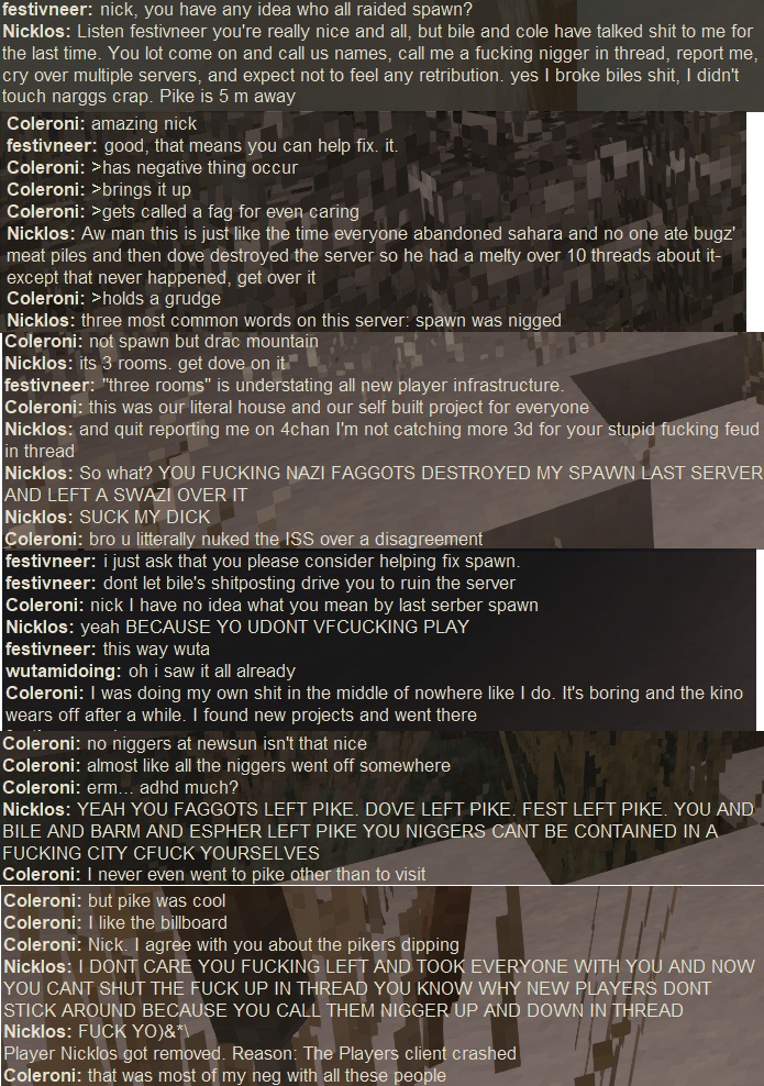 Bang Bang Edition:>Game NewsNext update is going to be the long awaited berry bush rework! Bushes are now useless. Tism tools will now be a vanilla feature.>Server NewspOG has had major road development, both norf and souf. A lot of anons have migrated souf. The survey mod was added to pOG (thank you onions) and barm made some great new maps for sbr.Guns (and some melee) from the pike and shot era were added to server. Anons have been enjoying blasting driggers to the rust dimension. There is a pvp event in the works similar to the old siege event with a possible added domination gamemode.Soufers making dust 2.Weekend serb had a 2fort event that was pretty based. Its doing a reset and might showcase xskills 2.0 in the next iteration.>/vm/ Vintage Story (pOG or nomap 2.0)165.217.128.185:9140A newer server with the culture and people of OG. Lightly modded. Focused on longevity and chan culture. Essentially OG's replacement. The server has nomap and nocoords. Its focused on civlarp and sticking together, and group projects. So far its been successful with multiple towns and roads. Almost all players live within 6000 blocks of spawn, something we haven't seen this late before with the exception of those moving souf on the new network.>Modded Weekend Serb:>174.73.170.143:42420Join for heavily modded weekend fun and shenanigans. New iteration coming soon.Reminder that Discord/ Reddit trannies (and others whom emulate them within these threads) are not, and have never been welcome. No servers will be added to the thread if they are associated with either. D*scord faggots get the rope.Thread Theme:https://www.youtube.com/watch?v=qgDrpWWxuto&list=RDqgDrpWWxuto&start_radio=1Previous thread: >>2319137