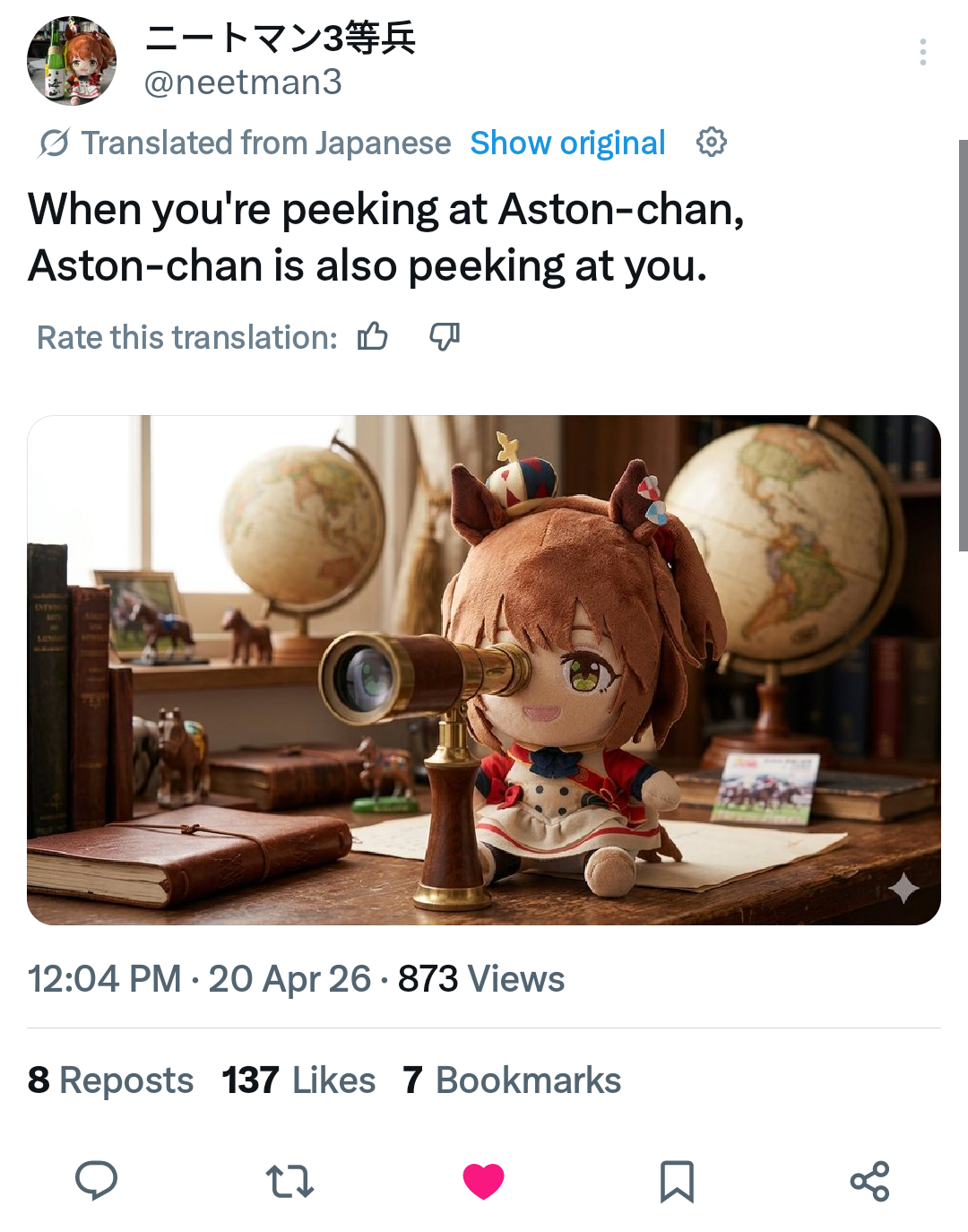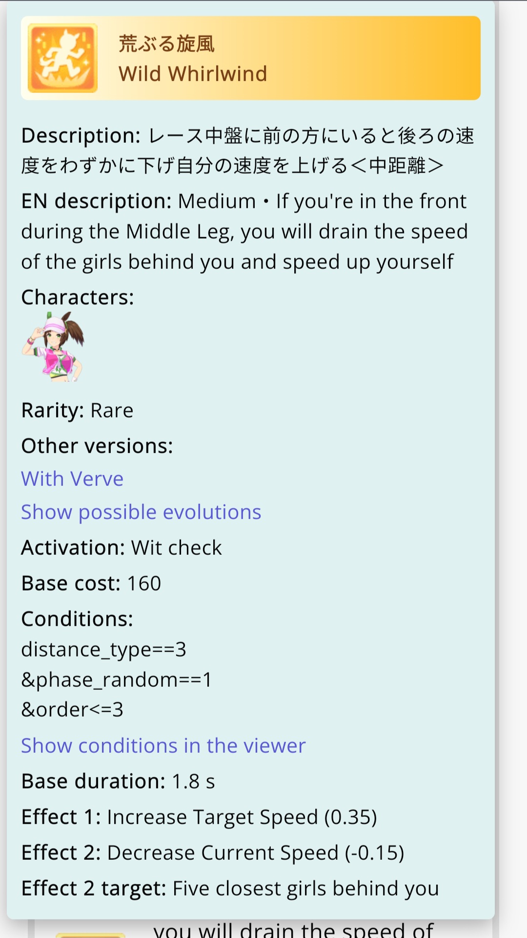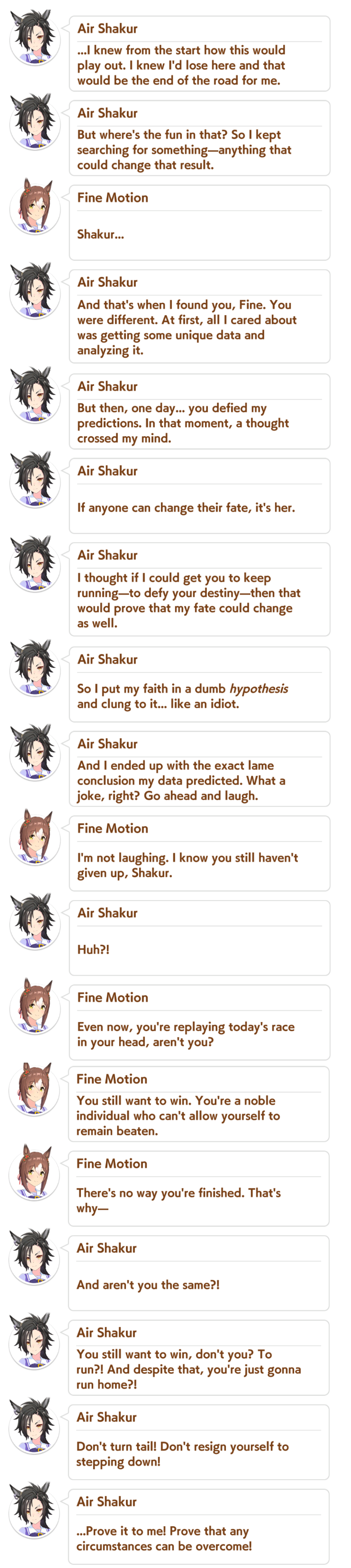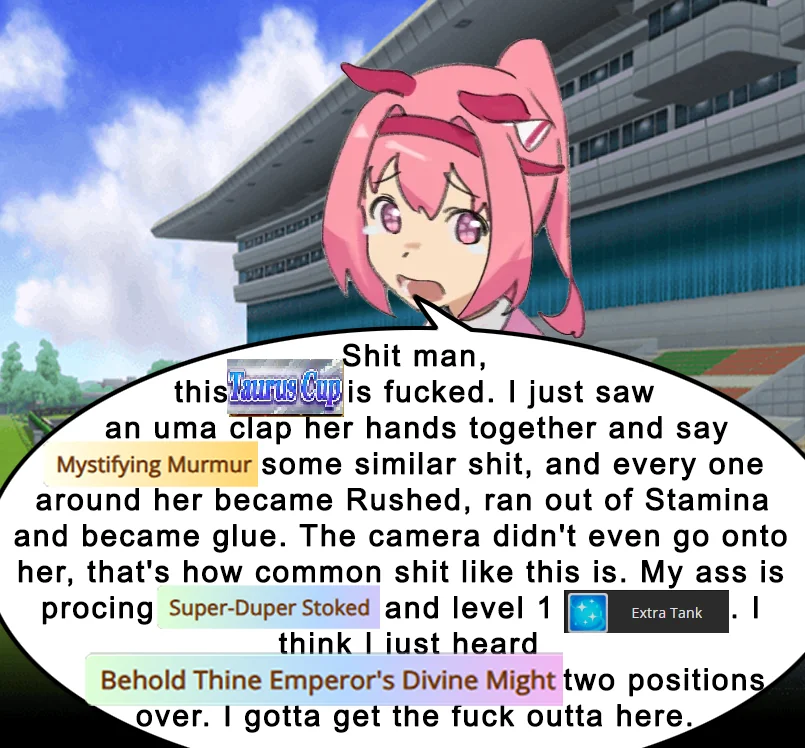 Aries Cup starting at 10pm, April 23Race Conditions: Nakayama, Turf, 2000m Medium, Right-Handed, Spring, Sunny, FirmWe also have Triple Crown races coming on the 25th and 26th.>URA ShoURA scenario, Spring, Good, Mile, Right, use one human card. Tazuna is not on this list for reason.>Shopsuki Shohttps://files.catbox.moe/5yaeva.pngEverything's in the image for your needs. I didn't forsee the Shakur free card and I don't know if I care enough to edit the picture. He didn't>Tenno SHOHNONONOBasically longslop hell of the last CM but you can only run umas in a style they have an E or below aptitude in. As an example, Grass can be run as a Front or End, Tamamo can only be a front, and so on. My apologies to Mayanofags, you know why.This userscript adds functionality to upload to Catbox directly from 4chan, for text-only posts, this also attaches the first Catbox link found, if any, to the post as a normal image.https://gist.github.com/catboxanon/ca46eb79ce55e3216aecab49d5c7a3fbYaeno Muteki debuts on Apr 20 (UTC), share builds, parents, host rooms and feed your horses