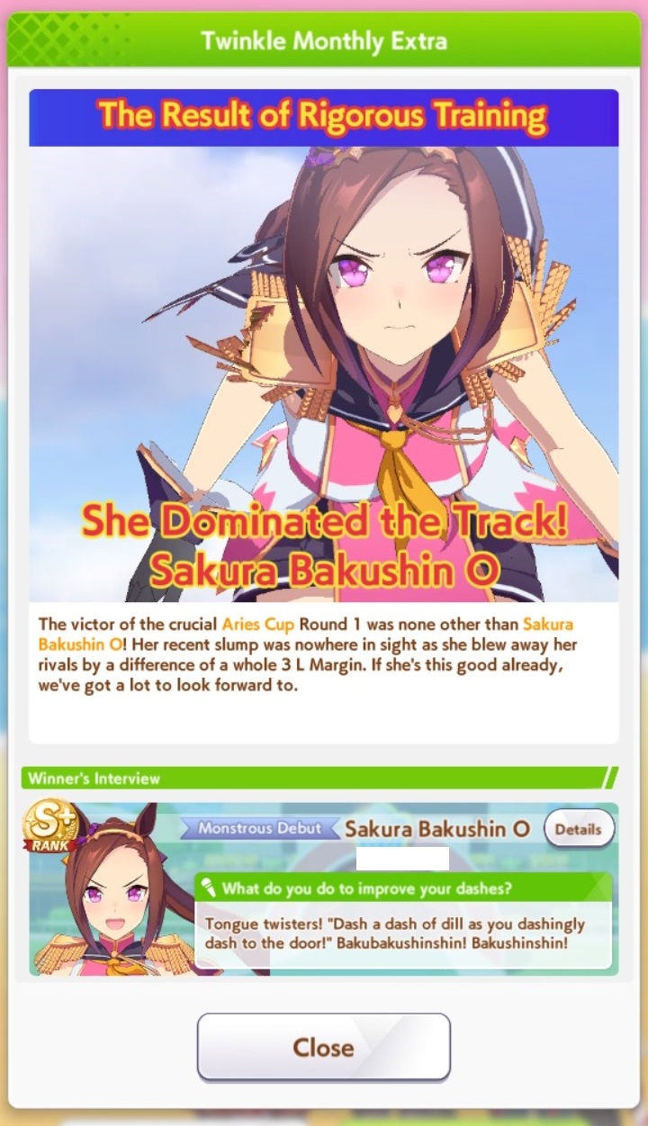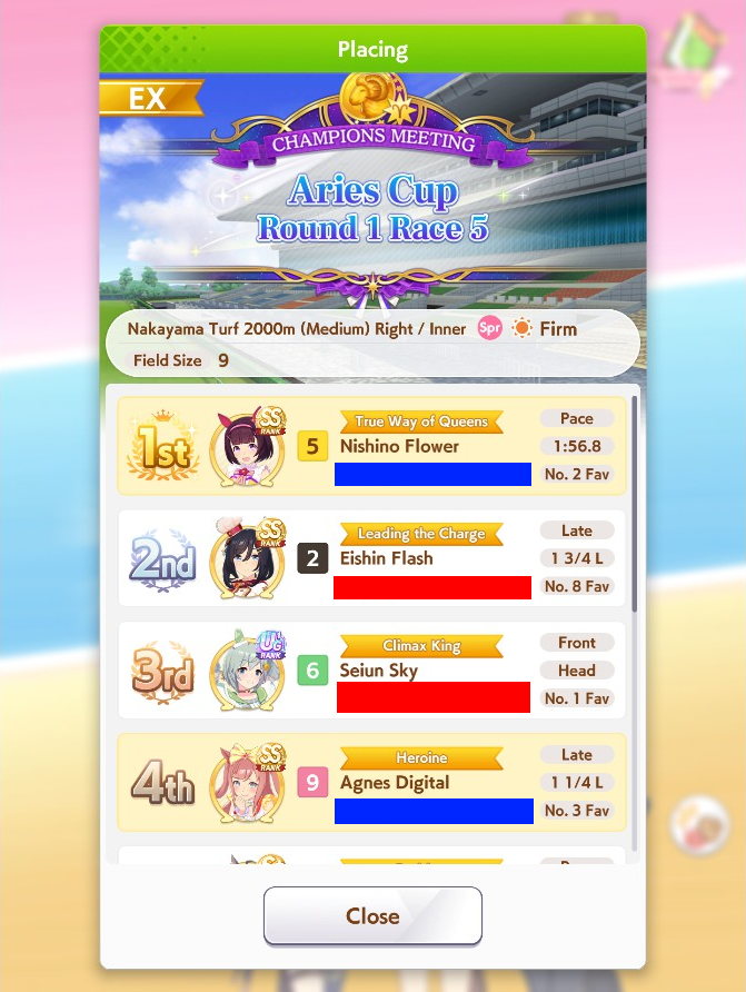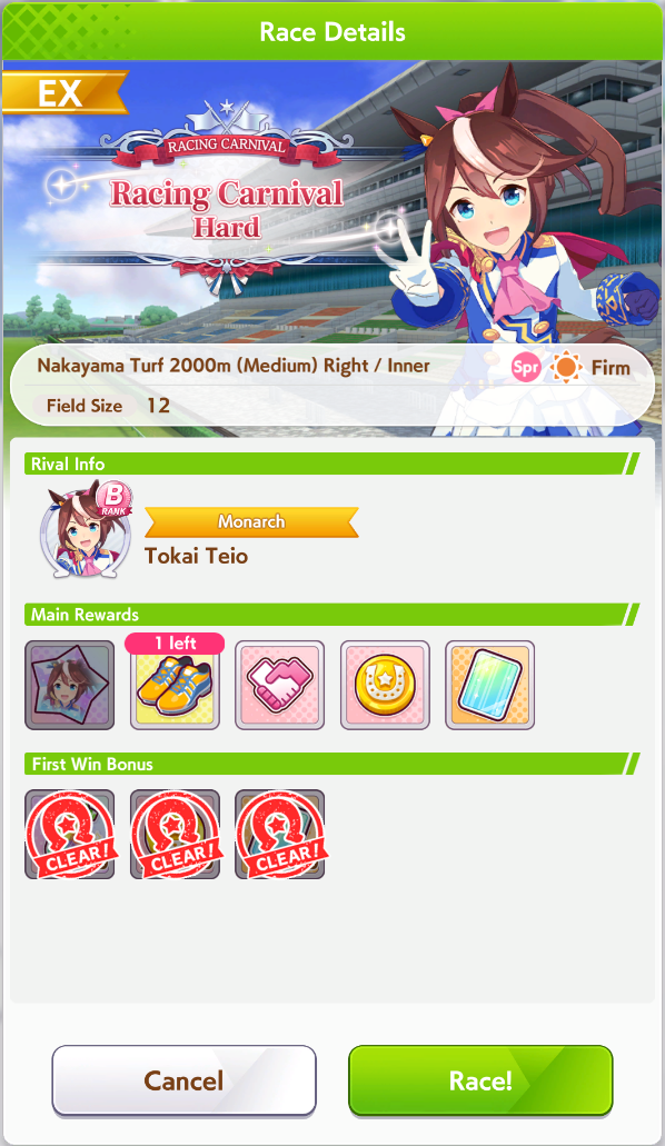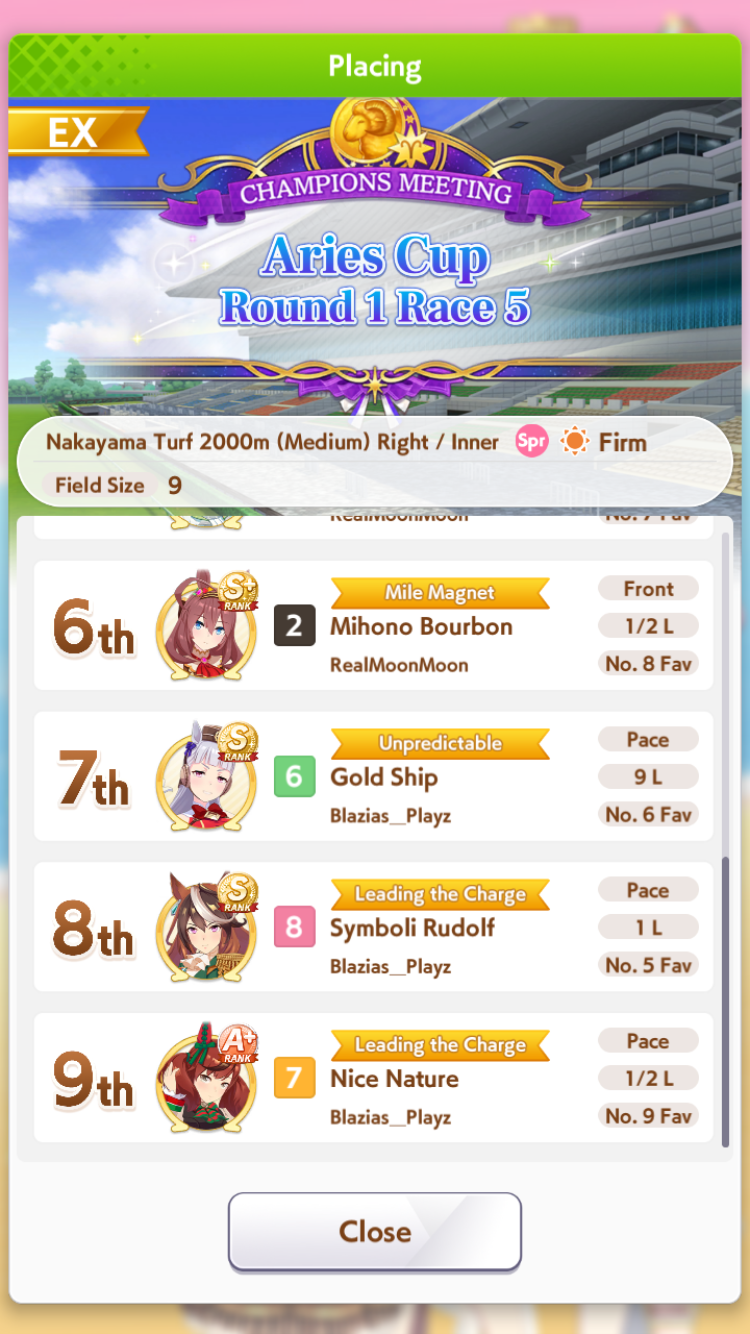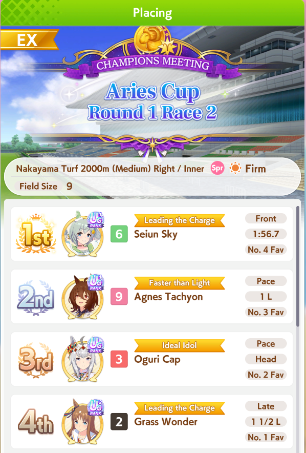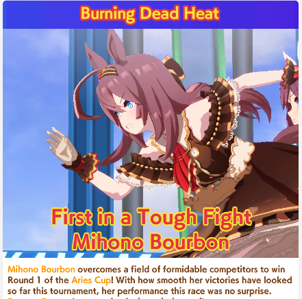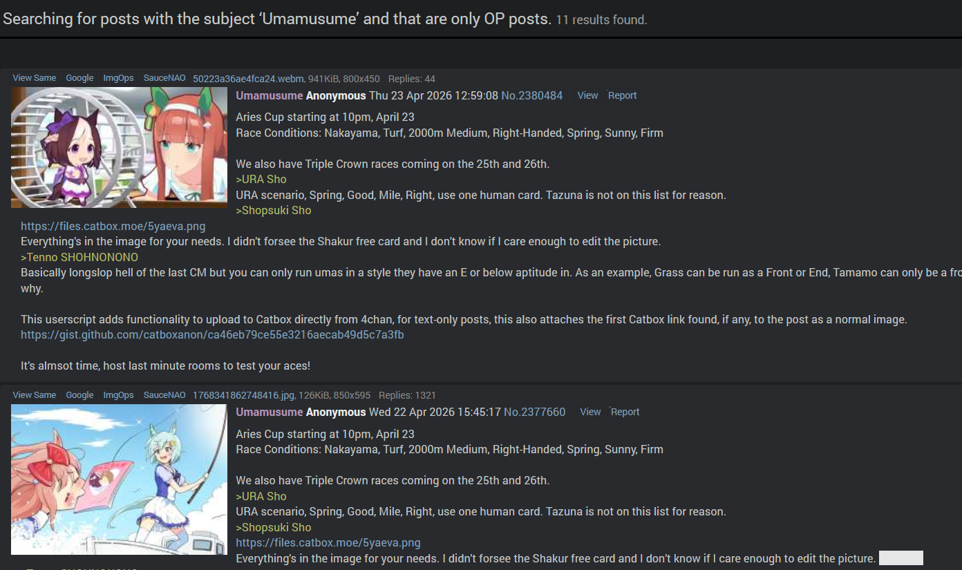 Aries Cup starting at 10pm, April 23Race Conditions: Nakayama, Turf, 2000m Medium, Right-Handed, Spring, Sunny, FirmWe also have Triple Crown races coming on the 25th and 26th.>URA ShoURA scenario, Spring, Good, Mile, Right, use one human card. Tazuna is not on this list for reason.>Shopsuki Shohttps://files.catbox.moe/5yaeva.pngEverything's in the image for your needs. I didn't forsee the Shakur free card and I don't know if I care enough to edit the picture. >Tenno SHOHNONONOBasically longslop hell of the last CM but you can only run umas in a style they have an E or below aptitude in. As an example, Grass can be run as a Front or End, Tamamo can only be a front, and so on. My apologies to Mayanofags, you know why.This userscript adds functionality to upload to Catbox directly from 4chan, for text-only posts, this also attaches the first Catbox link found, if any, to the post as a normal image.https://gist.github.com/catboxanon/ca46eb79ce55e3216aecab49d5c7a3fbIt's almsot time, host last minute rooms to test your aces!