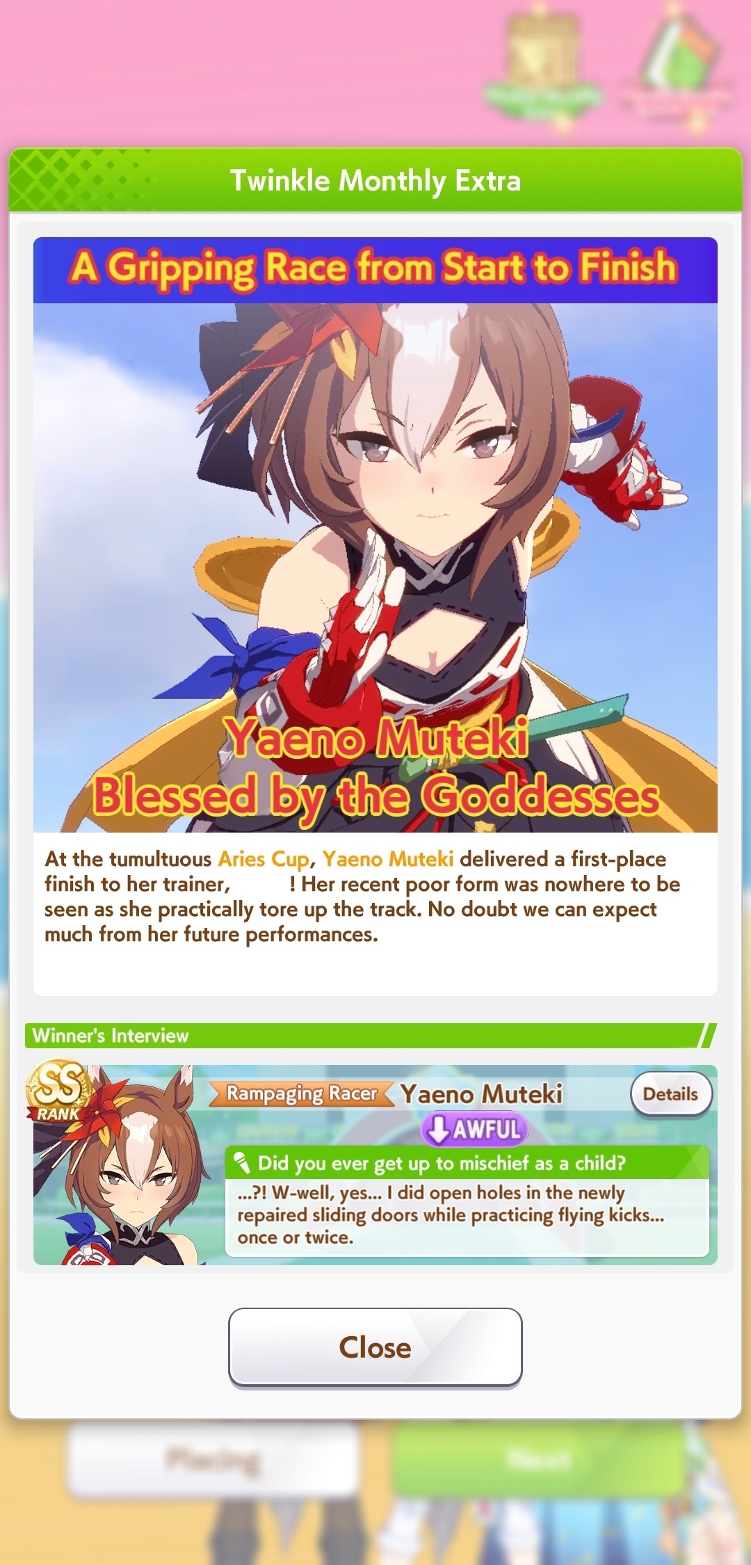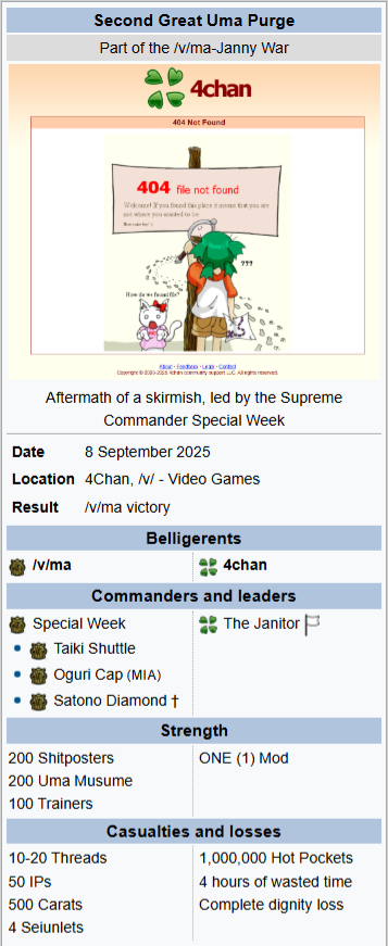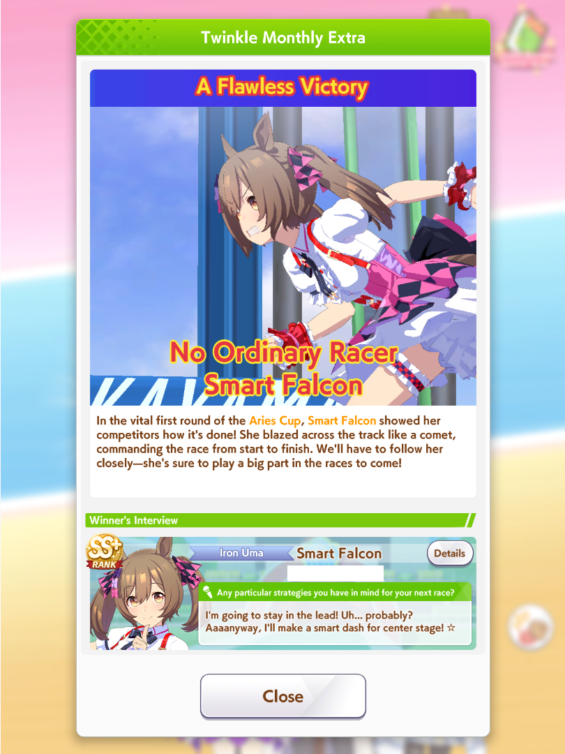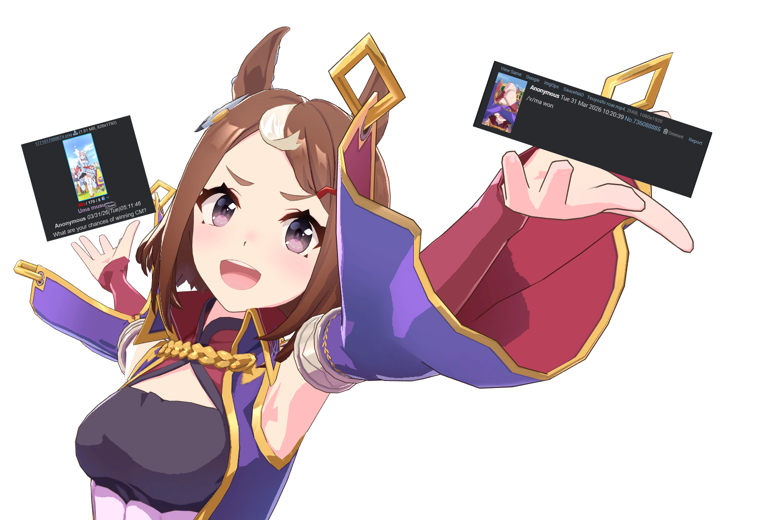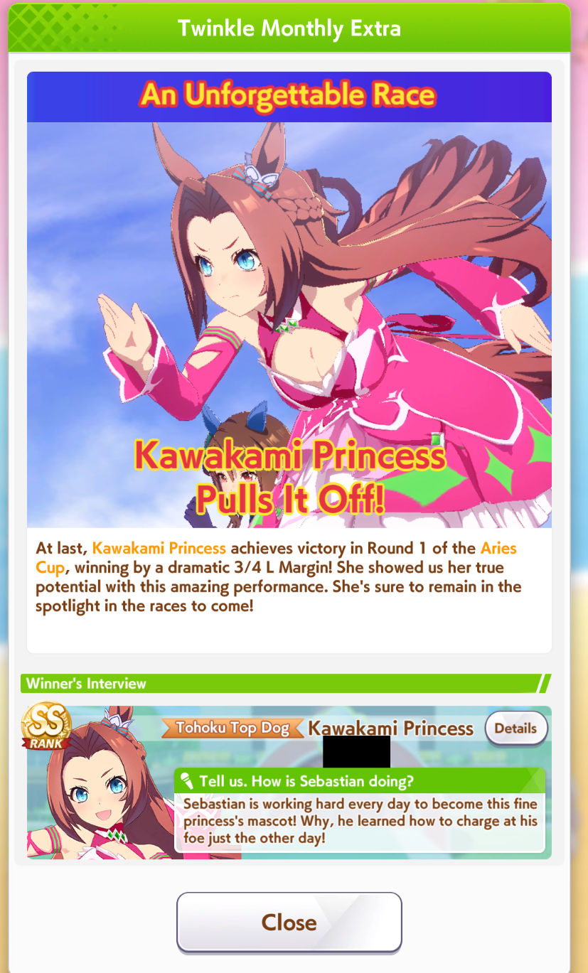Aries Cup starting at 10pm, April 23Race Conditions: Nakayama, Turf, 2000m Medium, Right-Handed, Spring, Sunny, FirmWe also have Triple Crown races coming on the 25th and 26th.>URA ShoURA scenario, Spring, Good, Mile, Right, use one human card. Tazuna is not on this list for reason.>Shopsuki Shohttps://files.catbox.moe/5yaeva.pngEverything's in the image for your needs. I didn't forsee the Shakur free card and I don't know if I care enough to edit the picture. >Tenno SHOHNONONOBasically longslop hell of the last CM but you can only run umas in a style they have an E or below aptitude in. As an example, Grass can be run as a Front or End, Tamamo can only be a front, and so on. My apologies to Mayanofags, you know why.This userscript adds functionality to upload to Catbox directly from 4chan, for text-only posts, this also attaches the first Catbox link found, if any, to the post as a normal image.https://gist.github.com/catboxanon/ca46eb79ce55e3216aecab49d5c7a3fbIt's almsot time, host last minute rooms to test your aces!