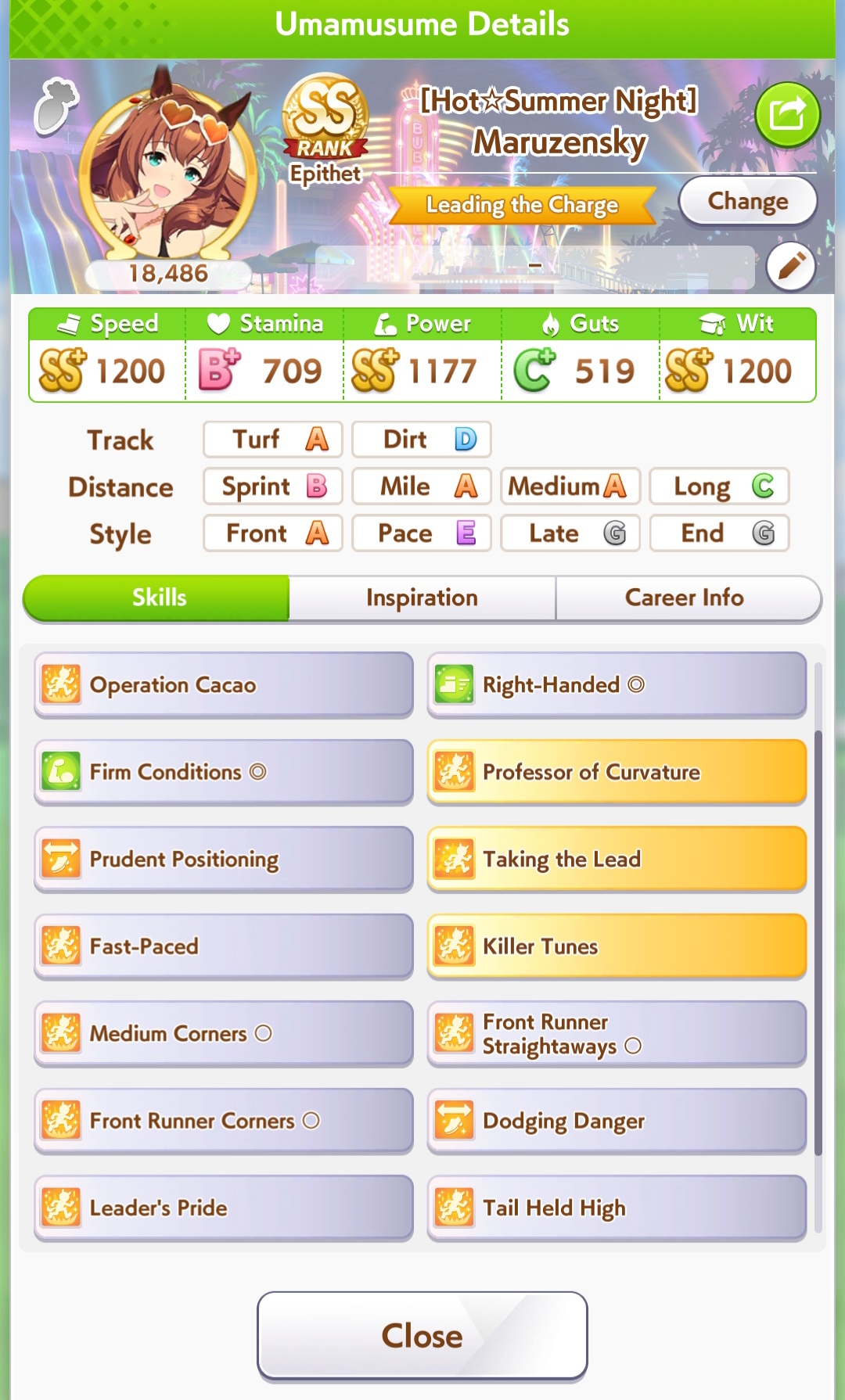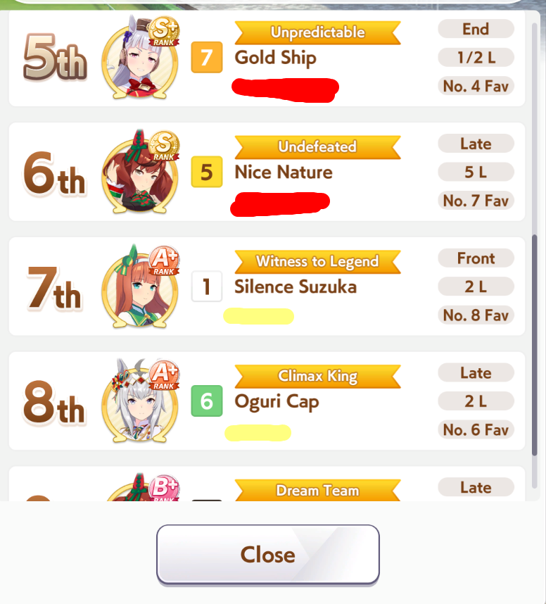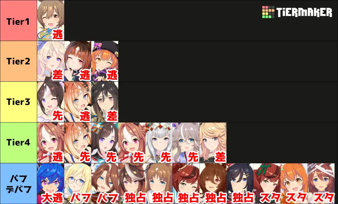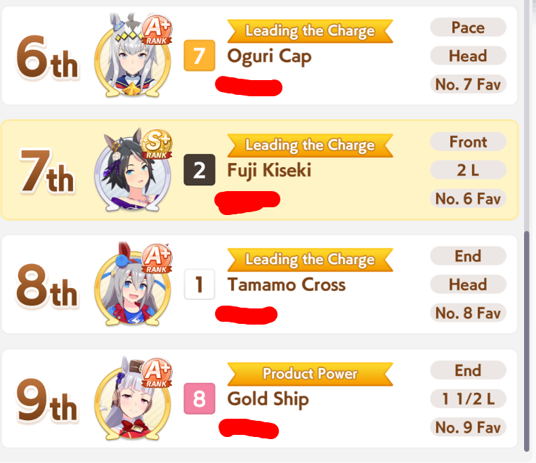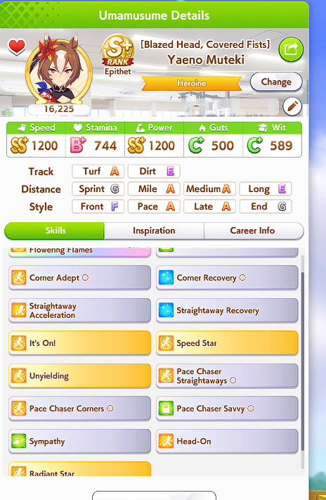 Yeah, I don't even know what's wrong with my building. I don't know how she gets outsped in the late race. I can get not catching up, but others catch up to her and sometimes she just stops mid-running despite being faster. I don't know what to do anymore. The rest have medium A so I can't replace her either.https://litter.catbox.moe/r4y64v4xrdym4kei.png