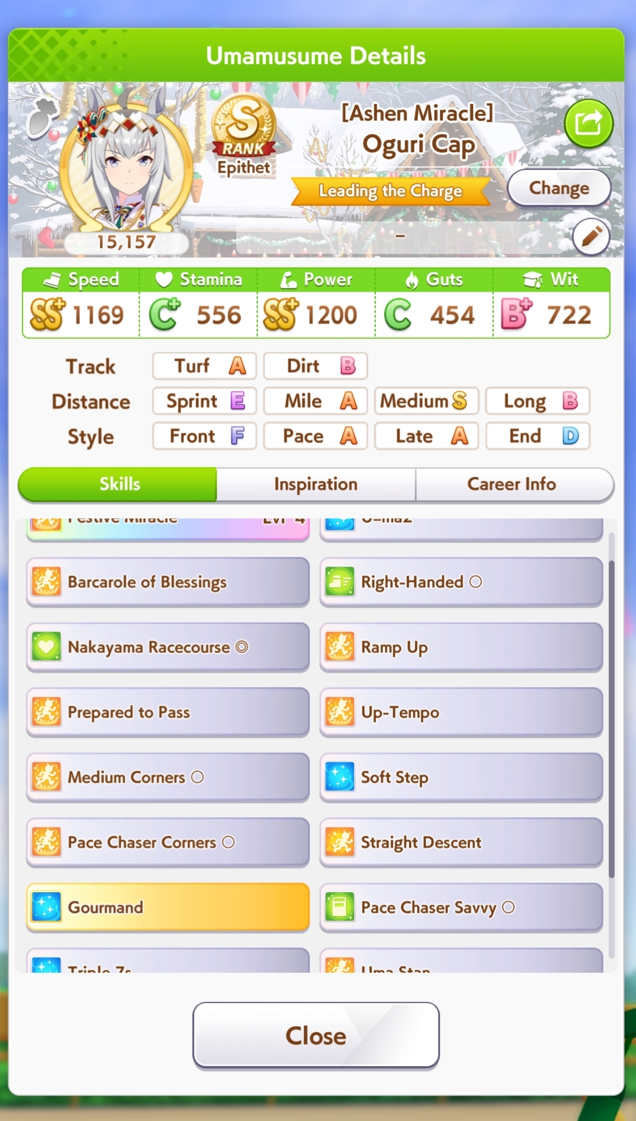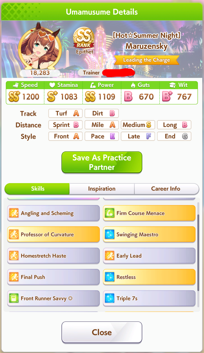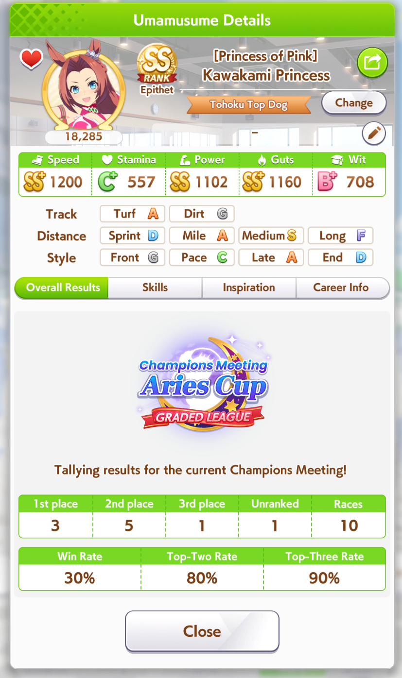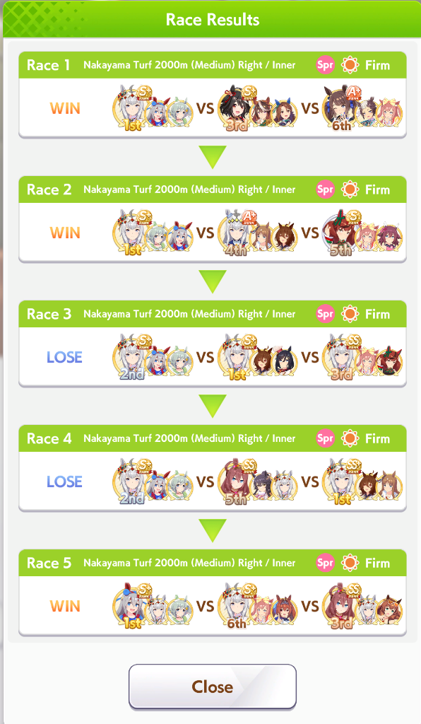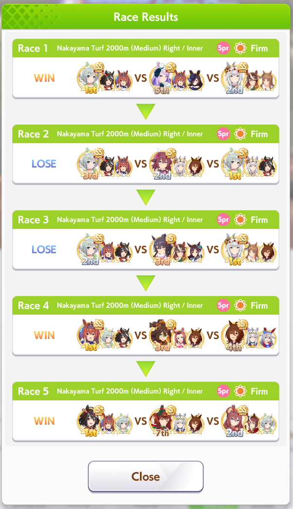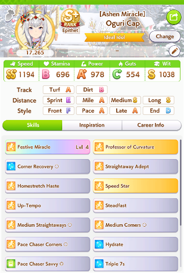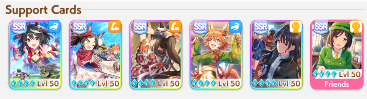 >>2382616https://litter.catbox.moe/ox9y6fh9s6voogl1.jpgHere's my 35% winrate one. Not pictured: Angling Lvl 5, Barcarole of Blessings, Firm Conditions, Spring Runner (both one circle)Deck was>Wit Bourbon>Wit Marvelous>Wit Tachyon>Creek>Kitasan>NTR (borrowed)all at MLB. Parents were 6* stam 8* power