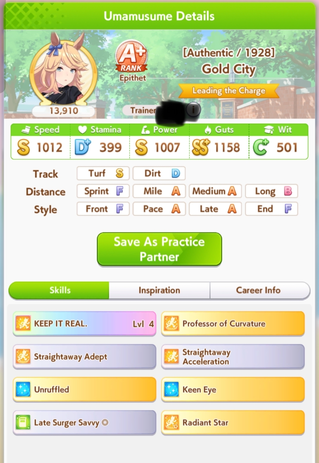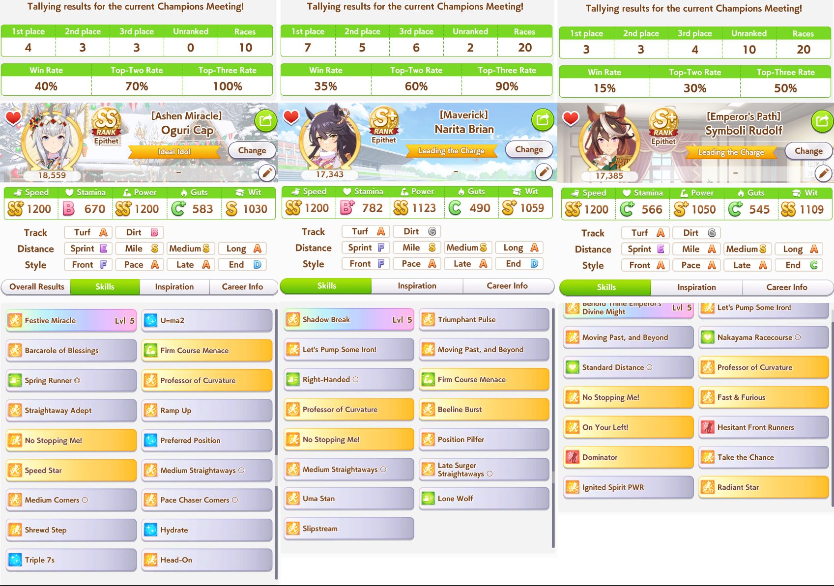 >>2382677I mean I have another one with actual mid-race, but she has Medium A so there's no point in running her, she'll just get beat down even worse. This is legitimately the best I managed. The problem I'm having is that even in late race she's losing, when she's in first or close to it. There is zero chance in hell this other Teio outdoes that one.https://litter.catbox.moe/96p8vw0uskjbapom.png
