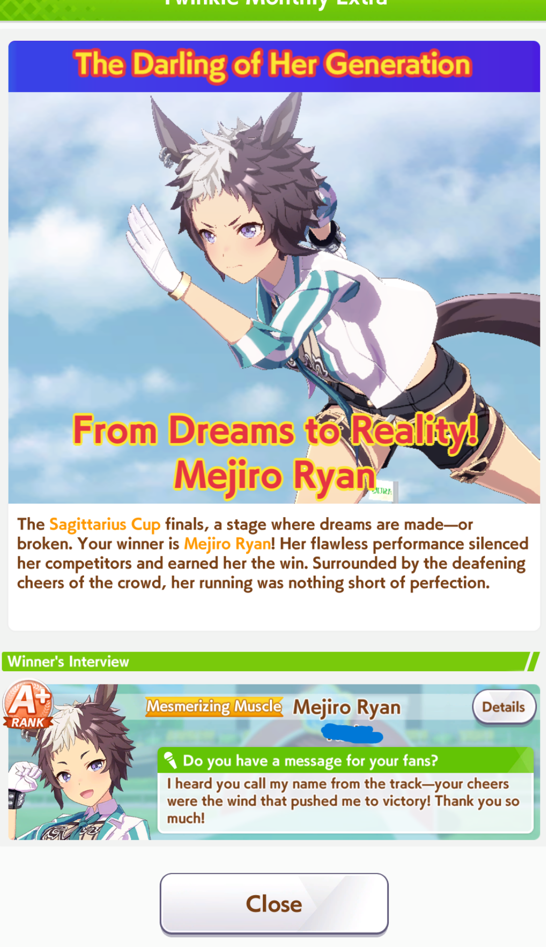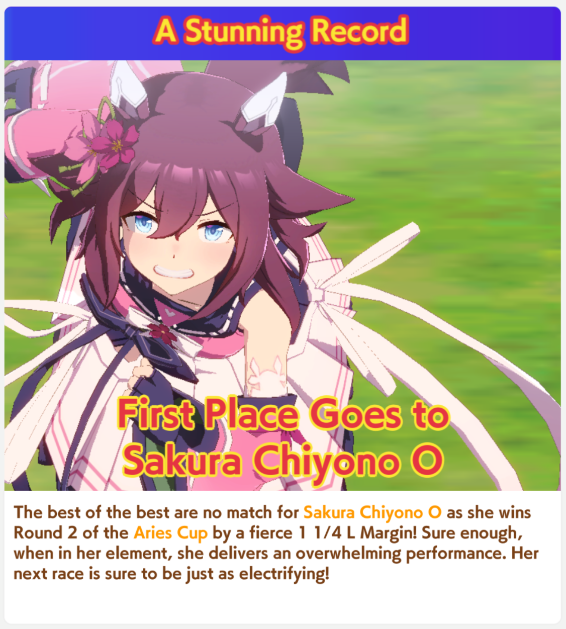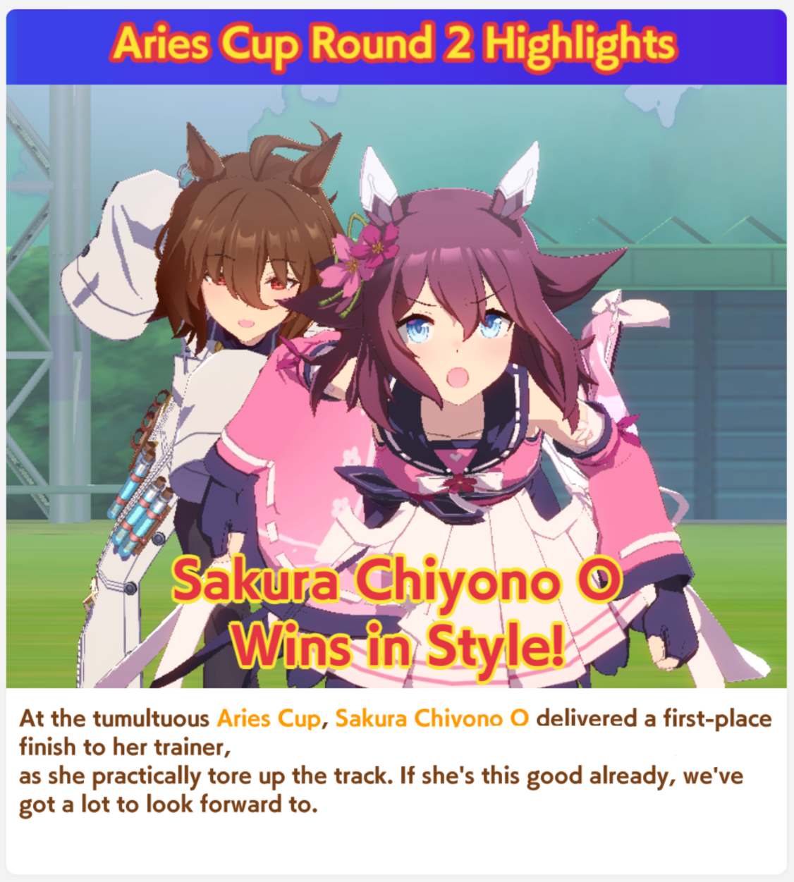 Aries Cup is NOW ONRace Conditions: Nakayama, Turf, 2000m Medium, Right-Handed, Spring, Sunny, Firm. Last day to hunt whales! (Or make finals)We also have the final Triple Crown race coming on the 26th.>URA ShoURA scenario, Spring, Good, Mile, Right, use one human card. Tazuna is not on this list for reason.>Shopsuki Shohttps://files.catbox.moe/5yaeva.pngEverything's in the image for your needs. I didn't forsee the Shakur free card and I don't know if I care enough to edit the picture.>Tenno SHOHNONONOBasically longslop hell of the last CM but you can only run umas in a style they have an E or below aptitude in. As an example, Grass can be run as a Front or End, Tamamo can only be a front, and so on. My apologies to Mayanofags, you know why.This userscript adds functionality to upload to Catbox directly from 4chan, for text-only posts, this also attaches the first Catbox link found, if any, to the post as a normal image.https://gist.github.com/catboxanon/ca46eb79ce55e3216aecab49d5c7a3fbDiscuss uma musume! It's nice nature's big day today say something nice about her!