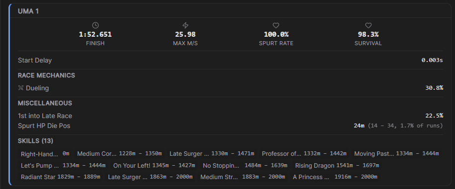 >>2393233>they all have 100% spurt rateYou are not taking into account late starts, rush, dueling, getting blocked, other debuffers, etc. Also Kawakami needs to be challenged to even trigger her ult, meaning extra stamina drain.