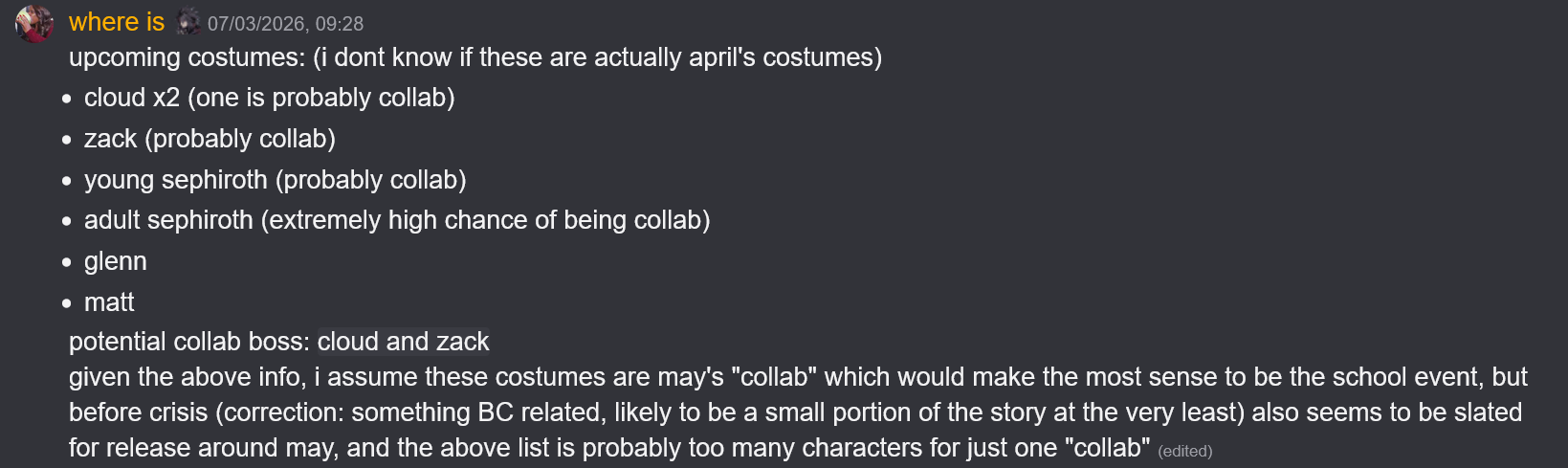 >>1972725No clue, every returning character from other games had their default appearance.Also, considering however nothing about new characters has been datamined, i wonder how they're even gonna present whatever part of the story we may see. Which is hilarious since Cissnei really has already the potential for alternate outfits like people everyone autistically screeched.
