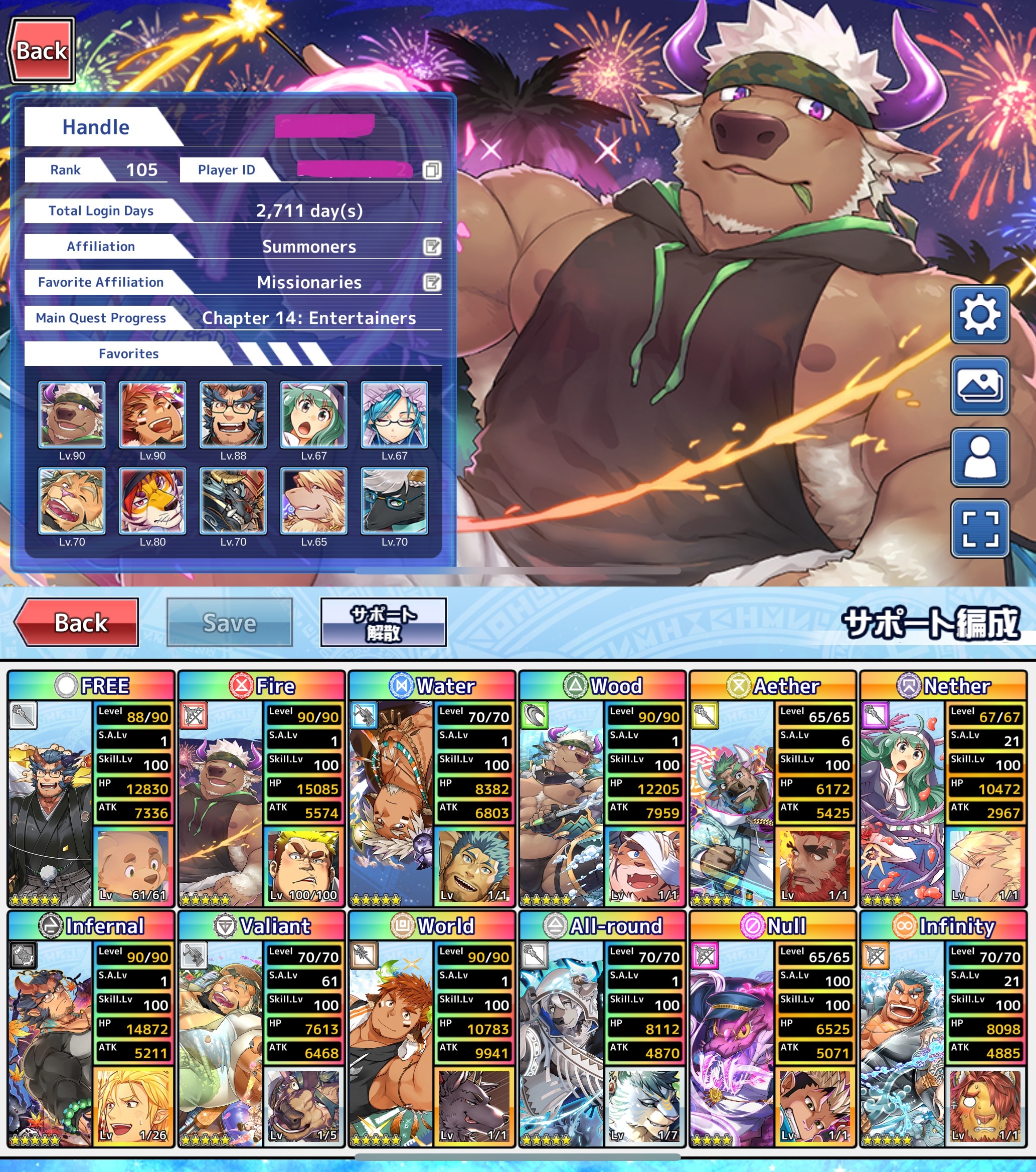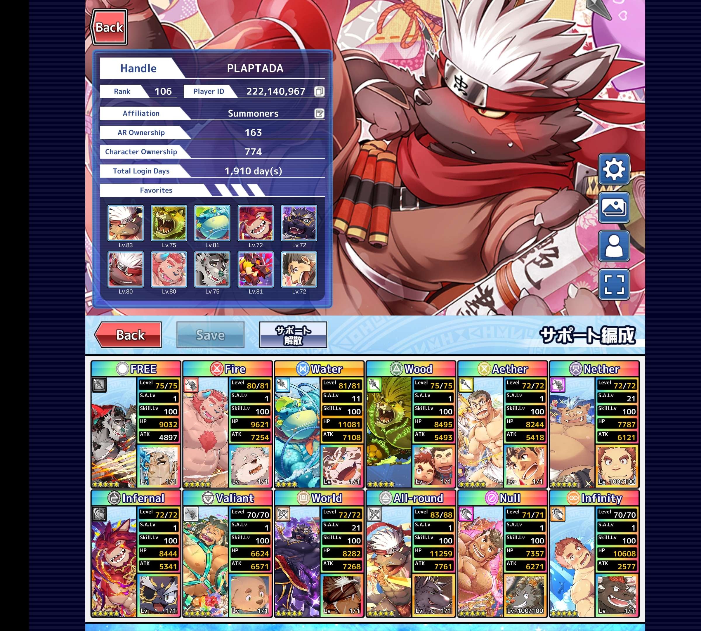 Krampus's 3D model has really been living rent free in my head for the past 24 hours. I wonder who made it I assumed maybe oaks but maybe not since he didn't retweet it or anything.>>1986260Here's my Profile Card and Support List. I really should use all the Seeds, Blossoms, and Experience Boosts I've been hoarding.>>1986292Wow 2,903 days you have my respect and I have to admit I'm a bit envious since that would be around the total days I would be at if I logged in everyday. Did you start playing before or after the English Translation was started?>>1986312>Mino and the loud lady are both referring to MynoghraOh I was not aware about that.>crossover is all but guaranteed at this point.You'd think one would have already happened considering how much of a no brainer it is. If one does happen it would probably be just Parallel Flight and the Summoners first and if more collaborations follow who knows who they'd pick for each game. It would be neat to see how they would translate LAH characters to Housamo's battle system and same with Housamo to LAH. Plus seeing Housamo characters get LAH battle sprites would also be neat.
