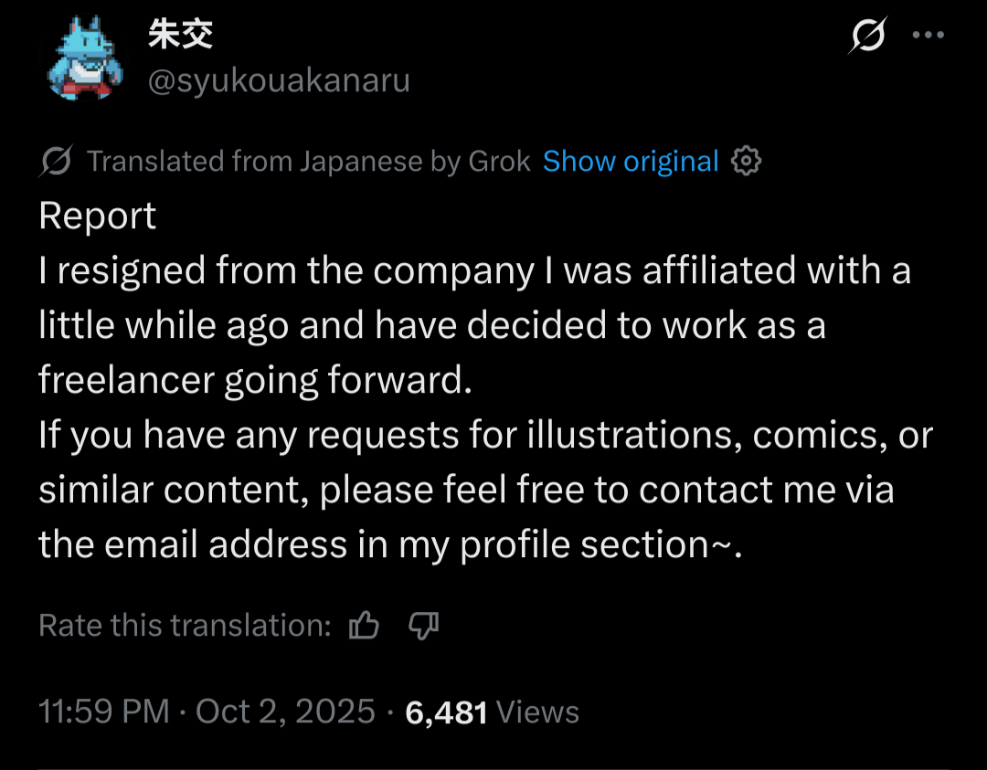 >>1855942Shukou has left the company for over a year now (some time after Valentine Rexer’s event), which explains why it took so long for the next MQ chapter to release, as he was the main writer for it. It’s only now that he decided to make a formal announcement about it. As for what will happen to his characters, they’ll need to commission him to make variants since he’s no longer an in-house artist. Now, I’ve heard some stuff through the grapevine regarding his future work with Lifewonders, and it’s implying that his relationship with the company is a lot better than most might think. tl;dr this actually changes nothing other than a new story director for MQ