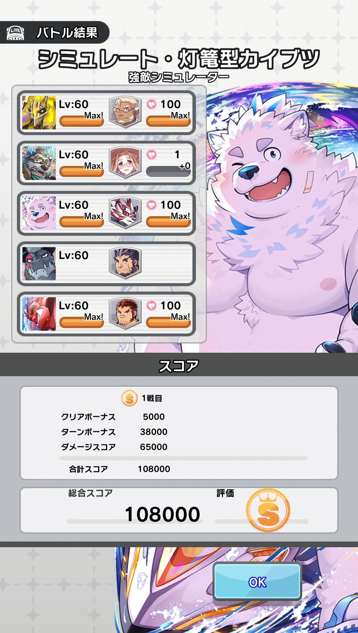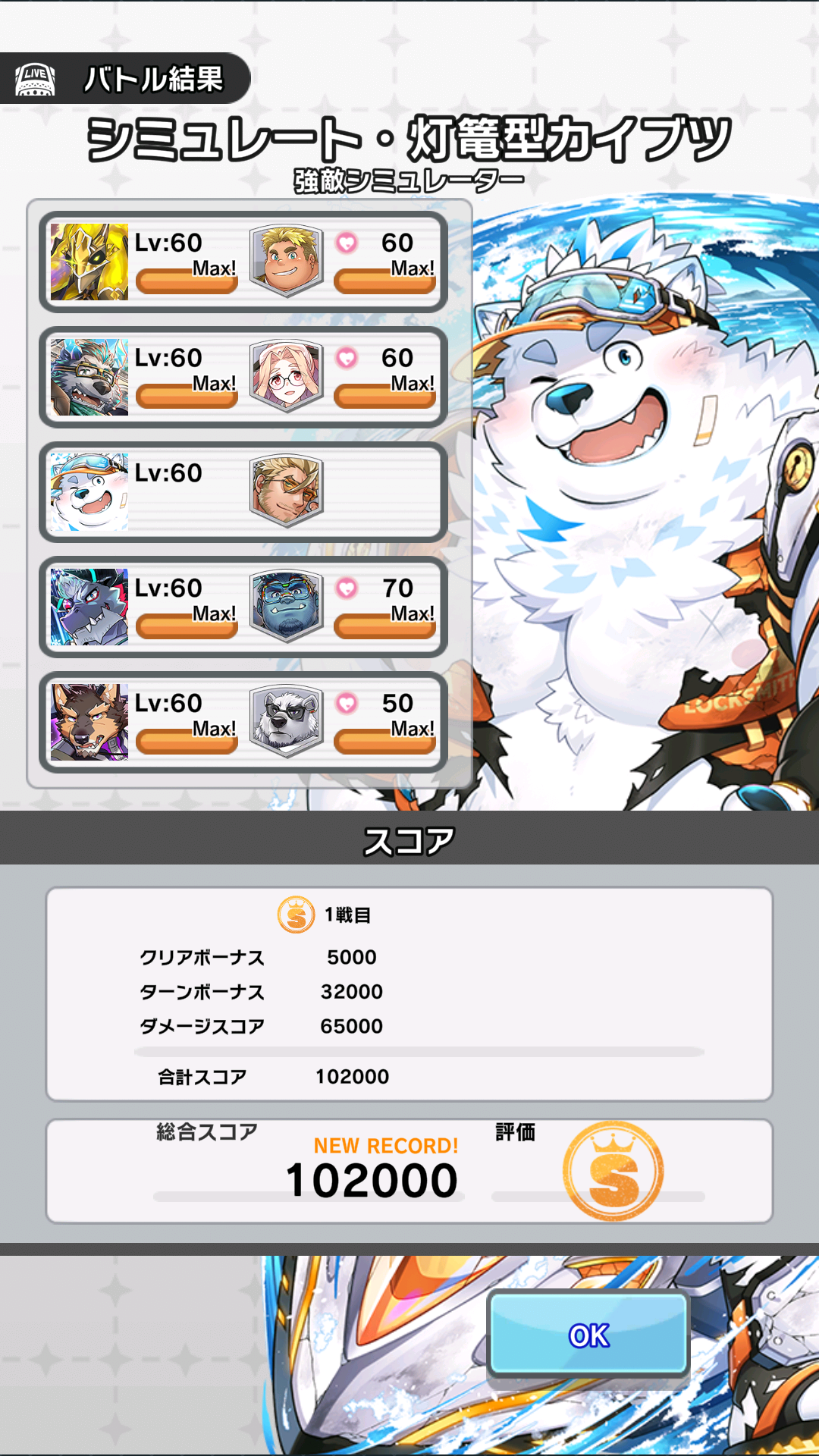 I somehow I managed to clear the SSS Rank Quest on a stupid trial run. It may have taken 10 turns and once again forgot to change Sidekicks but it's still a victory. Thank god Gomeisa survived for 8 turns just tanking all the unnecessary AOE damage I made the boss do and providing big healing with Fresh Green and VP generation. Of course the Support Astar was the biggest contributor.>>1866918Okay first thing I've noticed is that you haven't Bloomed any of your Heroes while I wouldn't say its required it is helpful to the 3rd Passive Skill Slot. You could try could what I did and basically brute force it with Sterio, Shattering Horizons Giansar, a Surfing Striker Astar Support for Follow Up and Explosion Damage and Spd Control with Giansar's 1st skill. Regular Pubraseer for Healing he might work I would have suggested Gomeisa but you don't have him. Maybe Valoray for spot healing and his Single Target Damage redirection with Diversion and with all the Follow ups his Caution Gauge should fill up quick for a easy 20% Atk boost. Yohack is also a good option like the other anon said to support for Support Astar.Sterio Sidekick- Kalaski because he gives the Hero he's with 5 Spd and that can help him act first.Passives- Atosis so once Explosion or Scar is inflicted his Follow ups will heal a little to the Hero with the lowest HP. Player so his 2nd and 3rd Skills are even cheaper. Exio for passive team Atk boost.Pubraseer Sidekick- Orbiter again gives 5 Spd like Kalaski but if you don't need healing you can use Orb's SK Skill to get View for Astar.Passives- Toshu or Akashi so Pub's Base Atk is higher for better healing. Sensettia she can increase healing by 10% Valoray Sidekick- Furlong can heal and give Valoray Invulnerability for the next attack he takes.Passives- Furlong or Crowne as they reduce damage taken by 10% I don't know if it stacks or not. Atosis same reason as Sterio if you plan use Valory's 1st skill. Again Player for VP reduction.