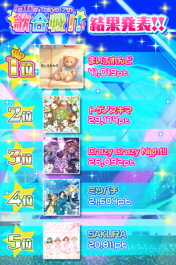 Sanbon Ribbon wins the contest.https://nyaa.si/view/2053139https://nyaa.si/view/2053138Sound of Sisters Step DLhttps://x.com/hrr_deremas/status/2012878784308097319The DJ Party setlisthttps://x.com/t7s_staff/status/2000891172131402131Anniversary Event will be another Fan Meeting. DaMina as 5th Wheel between YuuAi and AyuMako.https://x.com/t7s_staff/status/20127724025567028742053 3rd Live announced.What else? Oh yeah, NFT7S project is dead.