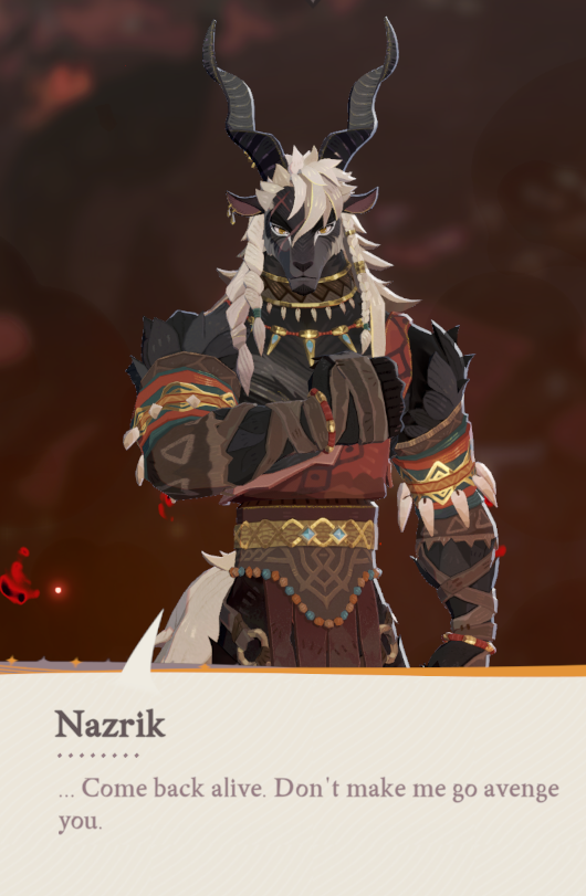 >>1857108At the end of the day I really don't care about who you like but it's really strange to me how you're trying to say Kordan is this fucked up guy and Nazrik is good when the only difference they have is circumstances.>Kordan tried to murder us while it was extremely clear we have been trying to help him from the get go.You are literally ignoring how half of the season hammered really hard into your head how their society worked, they saw sacrifices and offering your life to the goddess as an honor, in their eyes you weren't exactly helping them, you were just changing stuff around and they were fine with it since you were their god so if you wanted to change rules then so be it.It also needs to be taken into consideration how Kordan is a leader and his entire people's lives fall onto him, I really don't see how trying to ignore his goddess when she showed up right in front of him for a random human he didn't properly know, who just happened to be nice, would be the right move in any situation.>I'd rather fuck someone who would look after us.Nazrik had one advantage over every other wildborn, which was experience, unlike everyone else he saw what their goddess did to her people during the festival, she toyed with their lives and treated them like animals for fun. That was the only reason Nazrik hated her and the reason why he ultimately decides to help the party, if Nazrik didn't know that then he would be no different than Kordan or any other Wildborn, and if the other Wildborn saw what Nazrik saw they would probably also reach the same conclusion as him. This is where I'm getting at, Nazrik isn't good nor is Kordan evil, it's literally just a cultural difference and mindset they have. Nazrik would have tried to kill you even after you "helped" them in Kordan's place and Kordan would be more forgiving to you in Nazrik's place, so this Kordan hate and Nazrik dicksucking just feels strange to me.