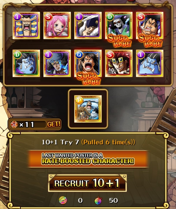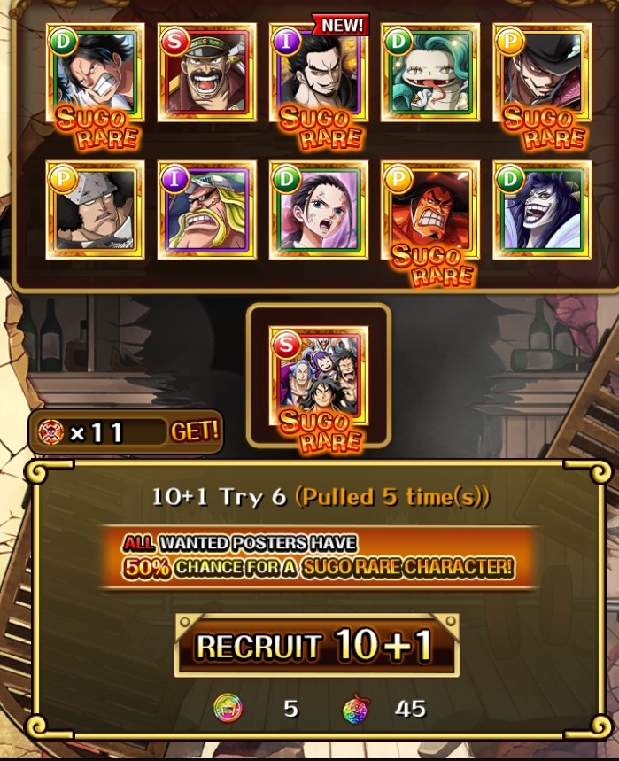 okay. in the last 8 single pulls on rocks pirates banner I got 2 copies of tandem ex sabo, a new dead kanjuro (meh), tm legend croc, and a dupe tandem luffy. wild stuff