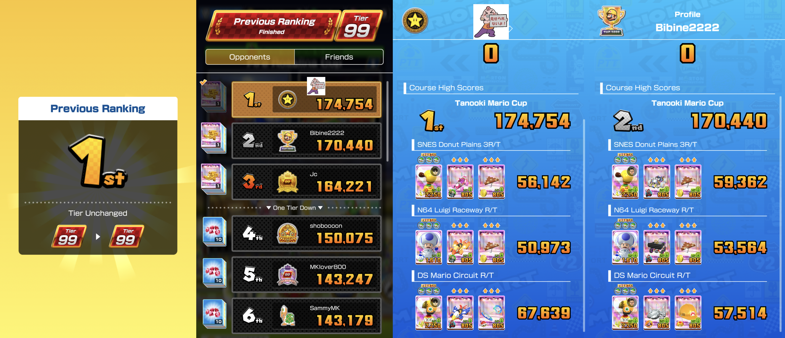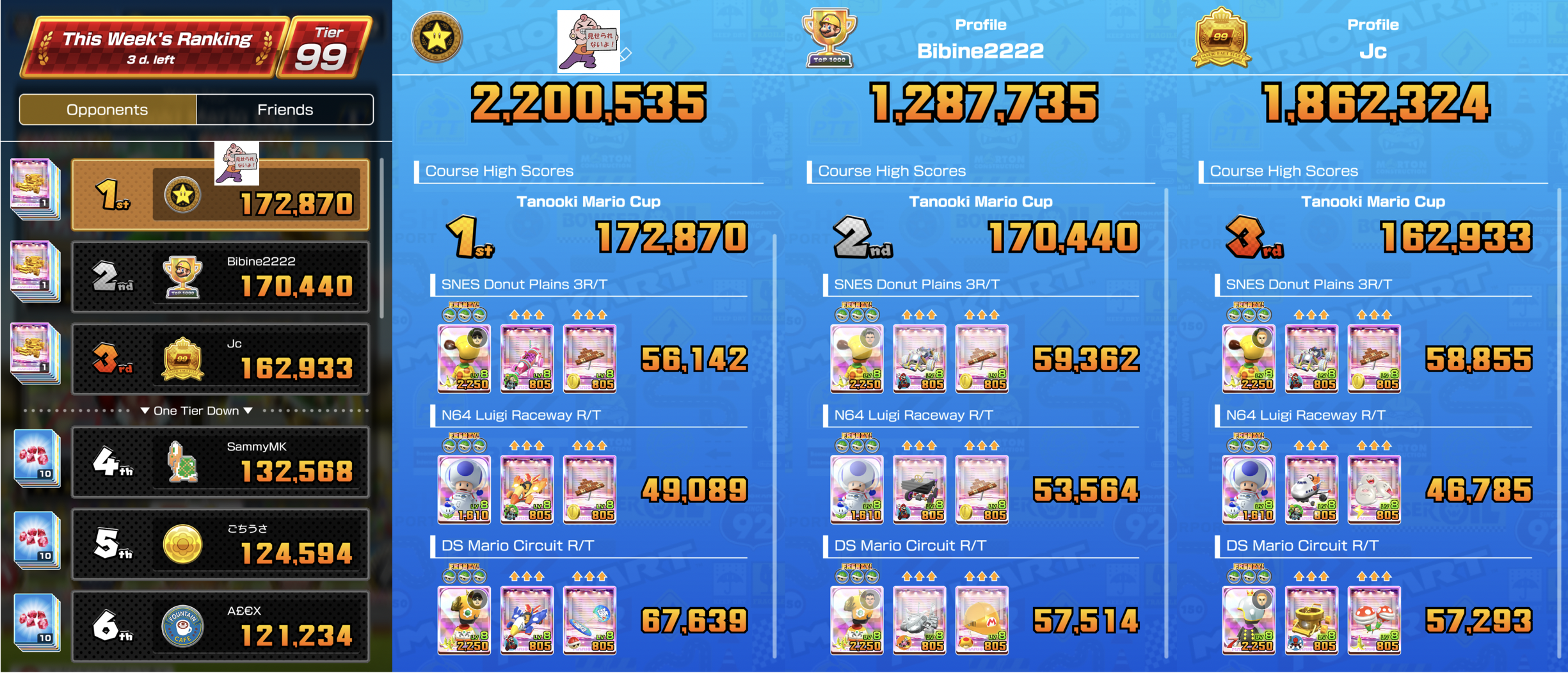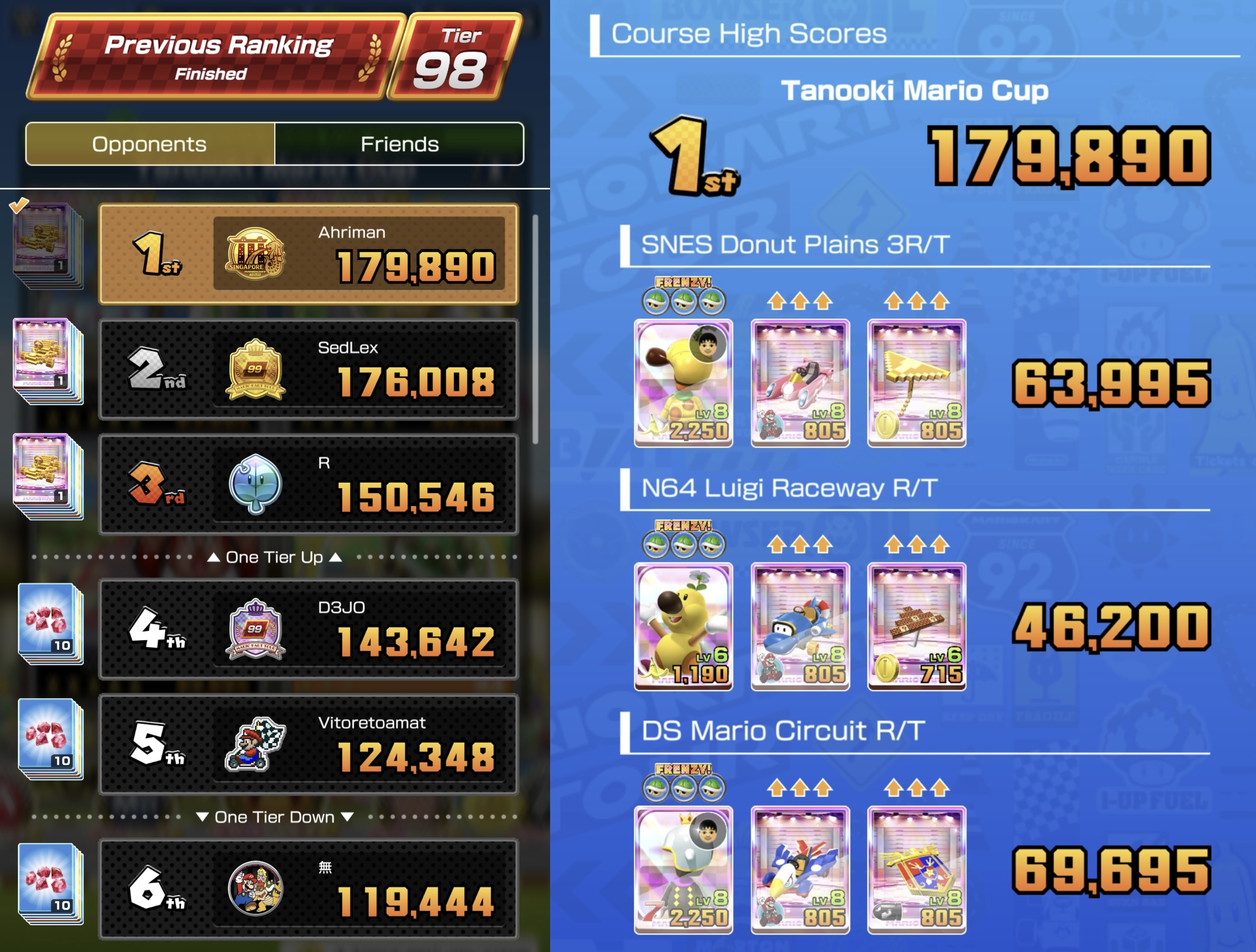>>1796861Update: Passed but regained 1st after spending tickets and regrinding.Daisy Cruiser: Yellow Mii went from Lv7/2c to Lv8/3c. Boo Pipes was already Lv8/3c and I quad capped it.Sydney Sprint R: Tuxedo Mario (Lv8/3c) got quad capped. I already have a Lv8/4c Astro Toad, but this is a terrible boomboxing track. I was also temped to take my Gold Mario (Lv7/2c) up to Lv8 because the top scores seem to be higher among my Tier 99 friends. But coinboxing is just easier.Lakeside Park: No change.