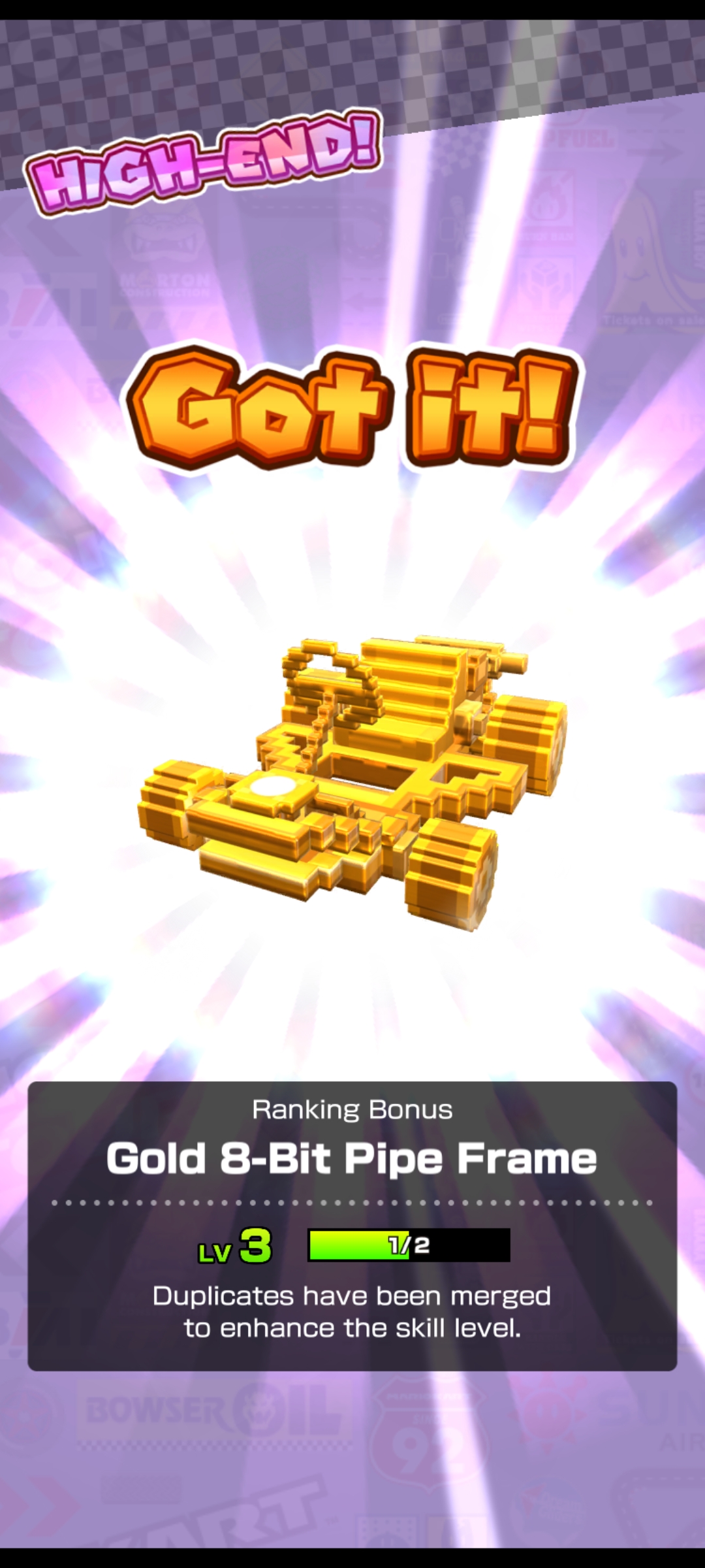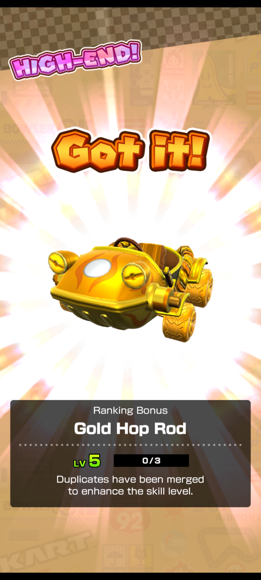 I also took this awful Sushi Racer kart from Lv7 to Lv8 for ACR. It was a frequent reward in Gold Pipes which I never invested in.I needed to unlock Cheep-Cheep Island R (Lv8 unlock) because I had no other decent kart for it, except maybe Yellow Offroader (Lv6/2c) which I rarely use.