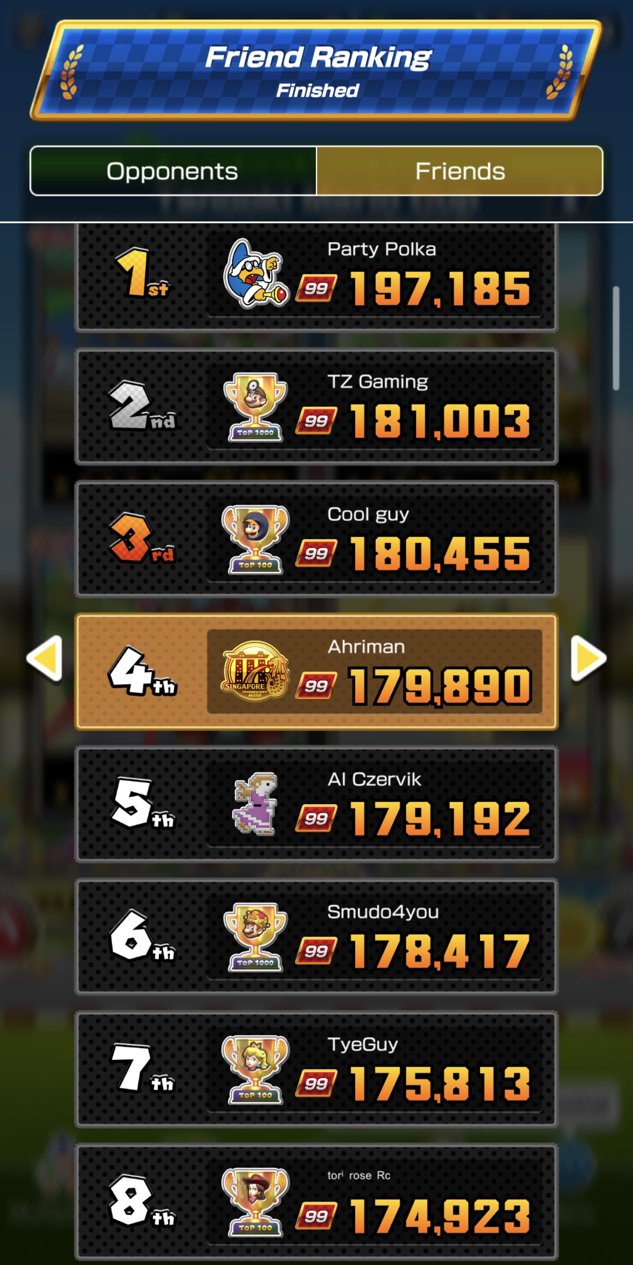 >>1924623Update: Opponent passed me twice today! I quad capped the Bowser Mii and improved on every track to reclaim 1st.