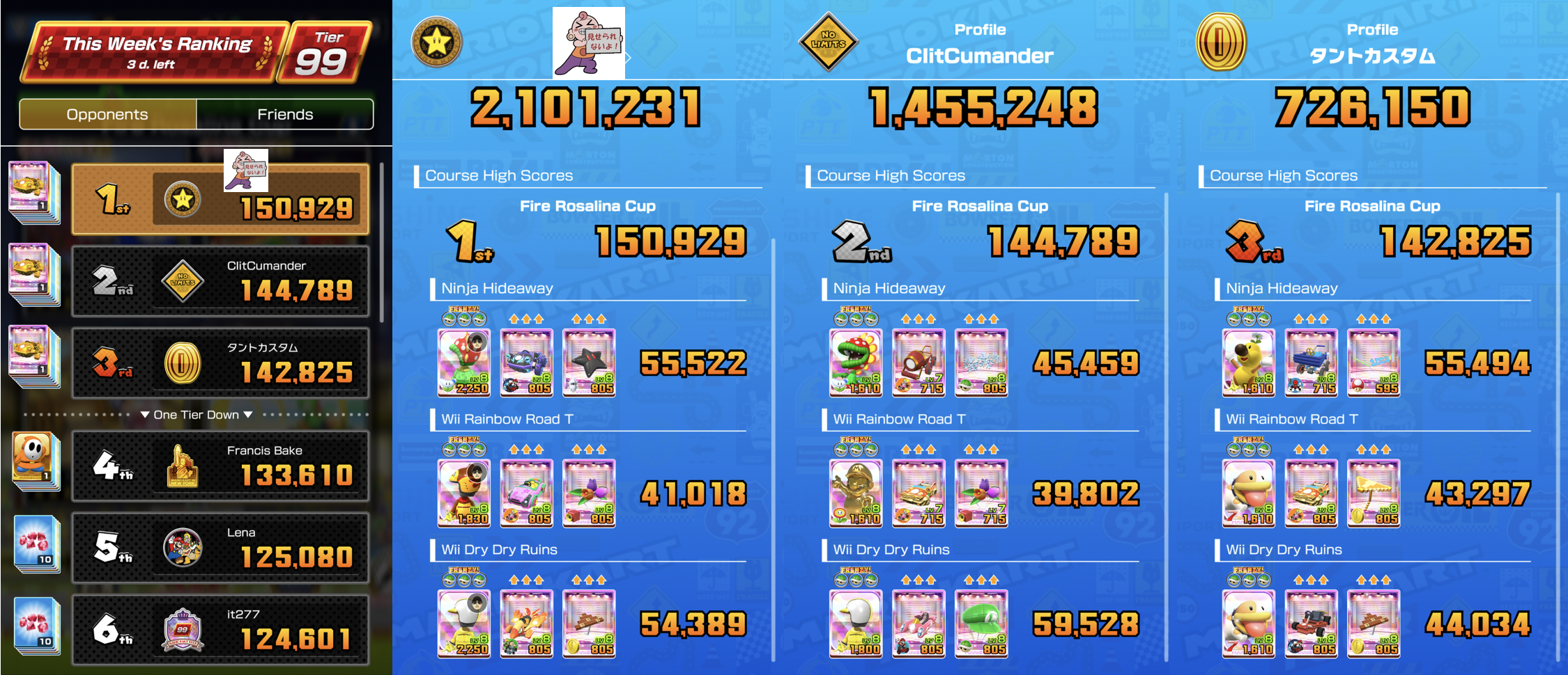 >>1937961W2 status: 1st place with some difficulty.Coinboxers seem to outscore Miis on Tokyo 4T and Bangkok 3N, while Miis still rule on Singapore 3R/T. I might need to level up my Thai Daisy (Lv7/3c) to raise my score on Bangkok 3N if I am passed again. Or I could quad cap the Gold Comet kart (Lv8/3c).