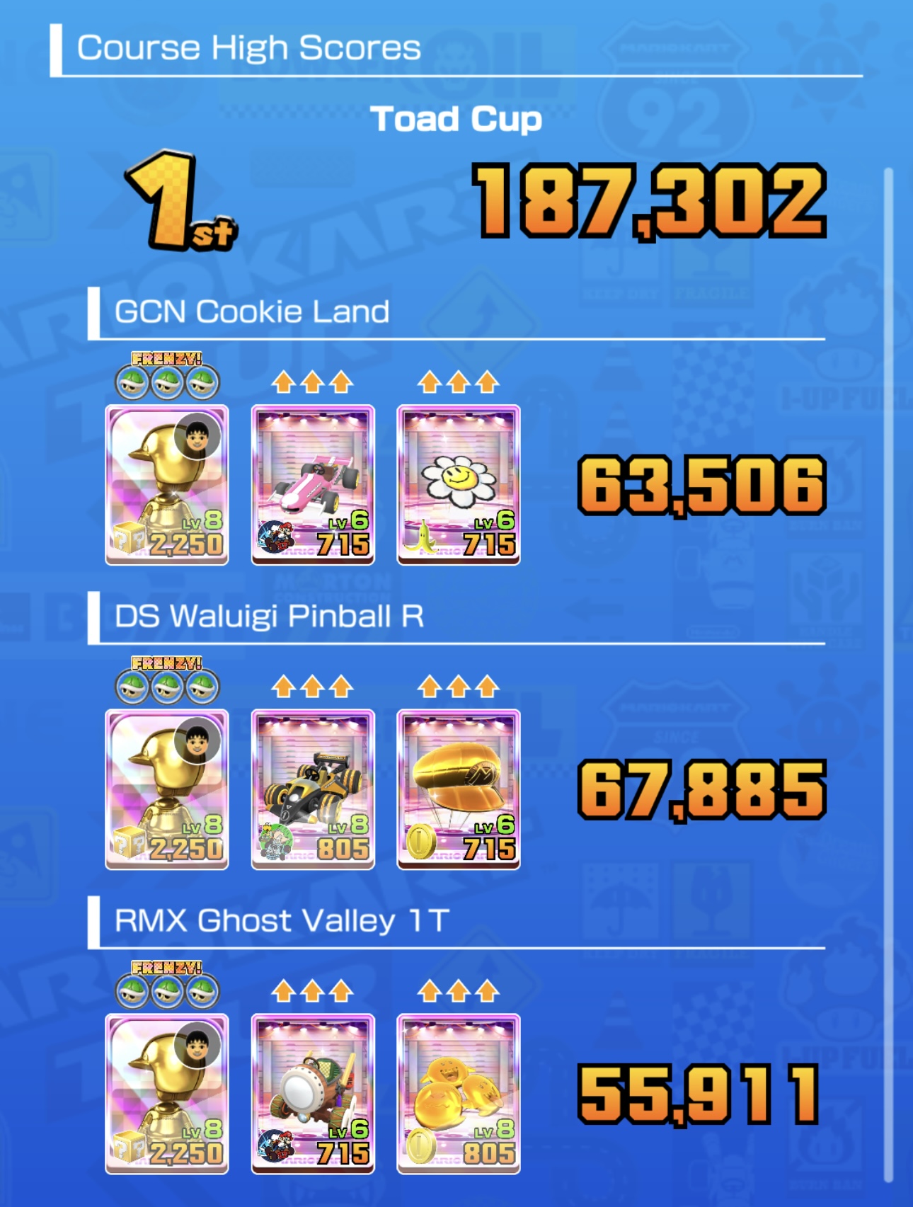 >>1907831W2 status: 1st place; solid competition. Improvement is possible on DK Summit R/T. Maybe need to add caps to King Boo Mii. I also have Lv8/4c Gold Wiggler (coinbox) and DK Gladiator (boomerang) top shelf on this track.