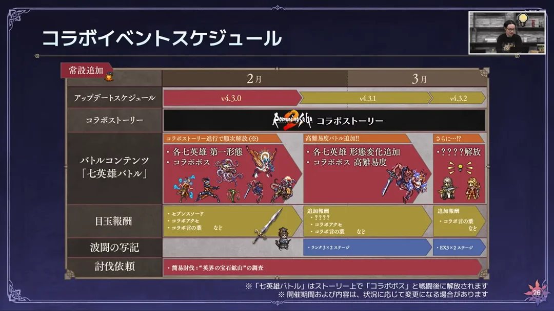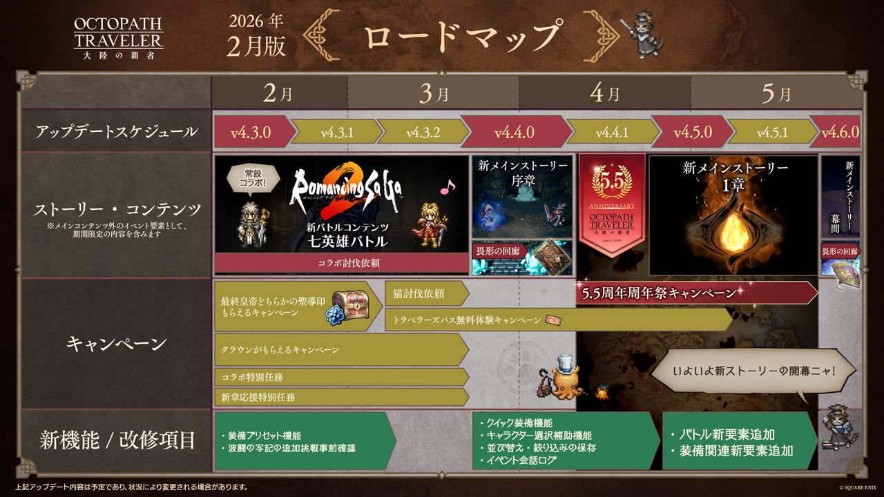 A new Roadmap dropped from JP.February - Romancing SaGa 2 Crossover.March - "Main Story" Prologue.April - "Main Story" Chapter 1May - "Maini Story" Interlude.