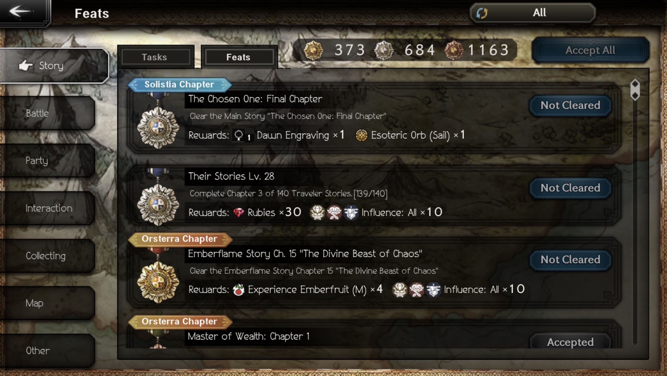 The 3.0 Updates are winding down. So let’s see who’s left to get:CHANCE ENCOUNTERS Morena (Scholar)SACRED BLAZECassia (Hunter)ARENA CHAMPION Aoi (Warrior)TRAVELERS OF MEMORIES EX Levina (Dancer)Mahrez (Warrior)Aviete (Cleric)CHAMPIONS OF MEMORY Avar (Apothecary)Esmerelda (Thief)SUMMER EX’SEX Rondo (Scholar)/EX Eltrix (Hunter)MEMOIRS OF SOLISTIA EX Ochette (Warrior)/EX Osvald (Cleric)EX Castti (Dancer)Kazan (Scholar)DRAGON QUEST IIIEX Cyrus (Warrior)/EX Viola (Scholar)/EX Molrusso (Dancer)EX Partitio (Thief)/EX Therese (Cleric)/ EX Signa (Apothecary)FINAL FANTASY IVTerra (Scholar)/Locke (Thief)/Edgar (Merchant)Celes (Warrior)/Setzer (Hunter)/Relm (Dancer)So that’s 15 weeks of new banners we’re looking at right now. Assuming they don’t pull travelers in from the 4.0 generation. Expect Part 5 to end in July:January (Chosen One 8)February (Dragon Quest III part 1)March (Dragon Quest III part 2)April (Chosen One 9)May (Crossed Paths Prequel)June (Final Fantasy VI part 1)July (Final Fantasy VI part 2)(Emberflame 7 and Aoi should appear somewhere within these updates)Enjoy and good luck with your pulls.