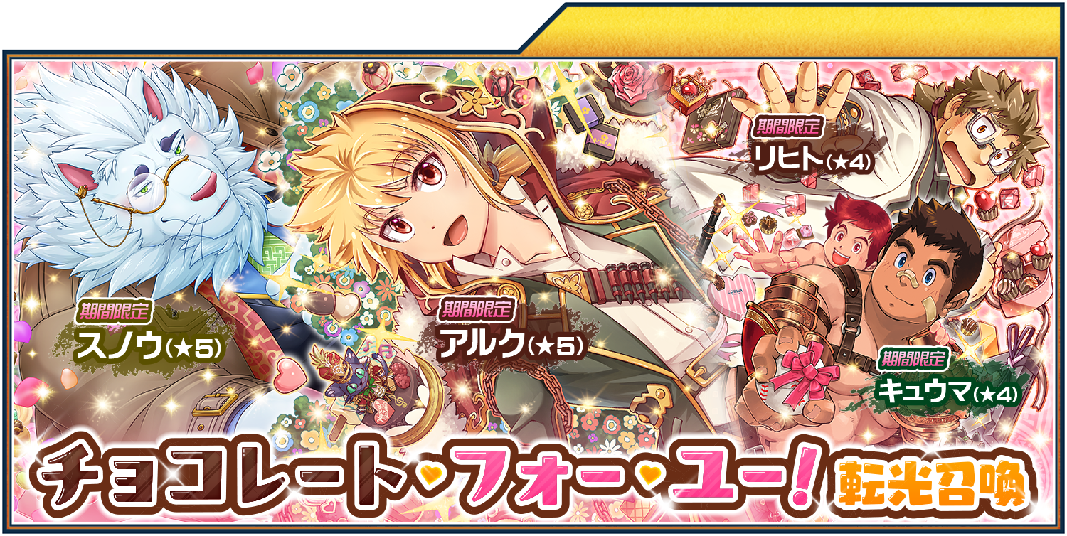 Earlier today a new Banner Chocolate For You! was added. It will run until March 2nd 23:59 JST and featuresValentine Arc 5starValentine Snow 5starValentine Kyuma 4starValentine Licht 4starWhile I'm just a little bit tempted for Snow and surprised his Valentine alt has been reran again in just over a year I'm going to skip. He's not the Aether Thrust Valentine lion I was really hoping would get another rerun by some miracle. As always if you do plan on Summoning I wish you the best of luck!