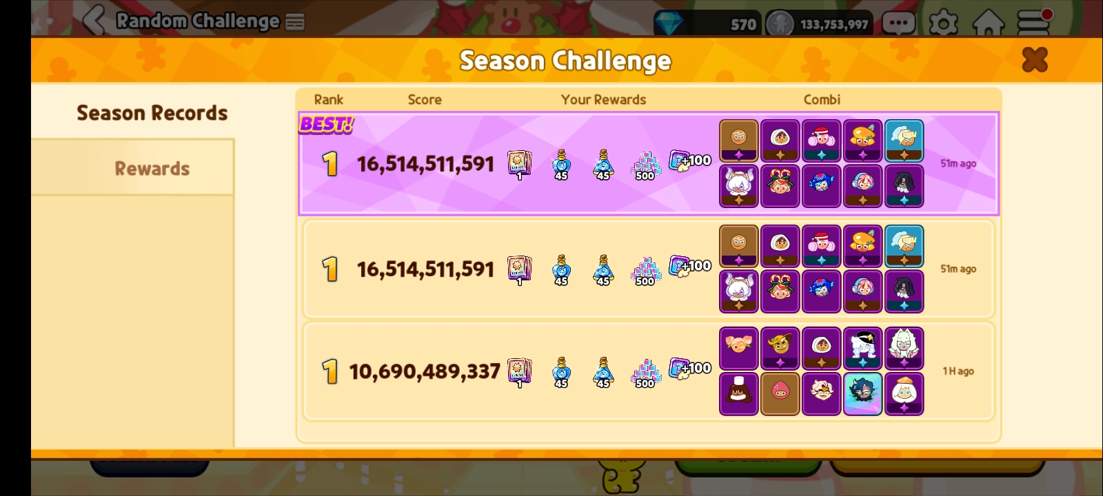 just had the wackiest random run i've probably ever seenstarted with some kind of "gingerbread's golden talisman" buff that just appeared with no event. i got a random event after like 7/10 of my runs. i got the 5x jellyco missile buff event twice. i got the ginger claus sueprbuff at the end of my 9th runner (permashield and impossible to fall in pits)i scored like 30bil and the guy in second place scored 12bil. insane shit.