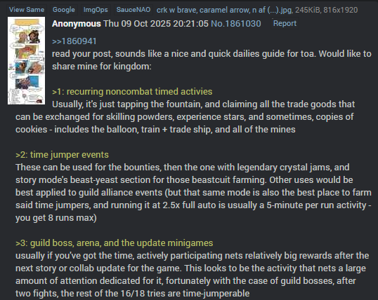 >>1923283Stole this general advice from >>1861030 so it's just doing the:>1: recurring noncombat timed activitiesCollect resources in your kingdom, or queendom for the progressives>2: time jumper events If you have time jumpers, great for guild boss raids, bounties, tropical soda islands, master mode crispia & 3* mode beast-yeast, and guild alliance artifact hunting>kind of me after coming back to CROB in may after quitting in 2021What made you quit in 2021, and what made you decide to come back again?
