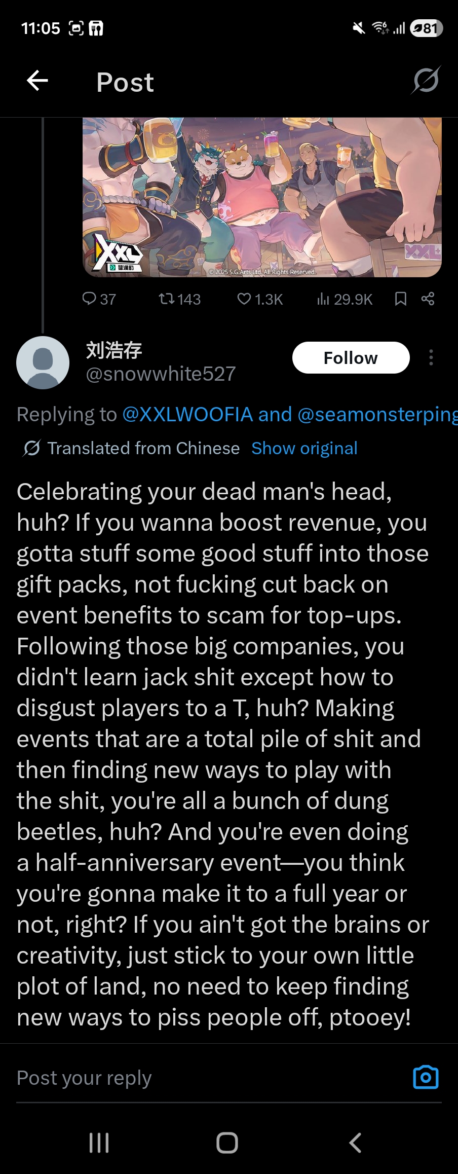>>1912553what a dogshit takeeverything in this patch has been a net negative for the average player's experience so no shit there's going to be complaintsusing other gacha as your defense just shows how fucking stupid you are.i've seen lots of entitled gachafags whine about stupid shit but sg arts deserve every piece of harassment thrown at them for this āupdateānever have I ever seen a game update reduce the quality of its in-game events by more than half. their idea of a half anniversary celebration was a complete joke, and I don't even need to go into the daily market changes with how much its been discussed in this thread.