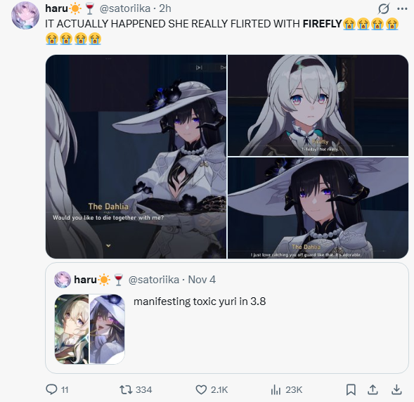 >>1907115>just reintroduced black swan lesbian dance with the new female character>this isn't even the first time they've done it, last time it was with acheron>last time they even released a 4* weapon using an illustration of the two dancing>this new character is meta for firefly, meaning if you want to use your official wife you need to stare at a canon confirmed lesbian who black swan is currently cucking you withyou tell me good sir