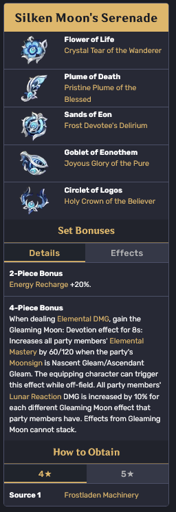 >>1925227>Also not sure about how much 'bina's performance drops with her being the sole NK character and set holderThe artifacts don't work at all without Ascendant Gleam. You'd need to put her on Golden Troupe or something.>>1925231You need NK resonance for the artifacts to work.Without the artifacts' bonuses, you have zero way to increase the reaction damage other than EM and Crit.You can't run EM on Noelle.