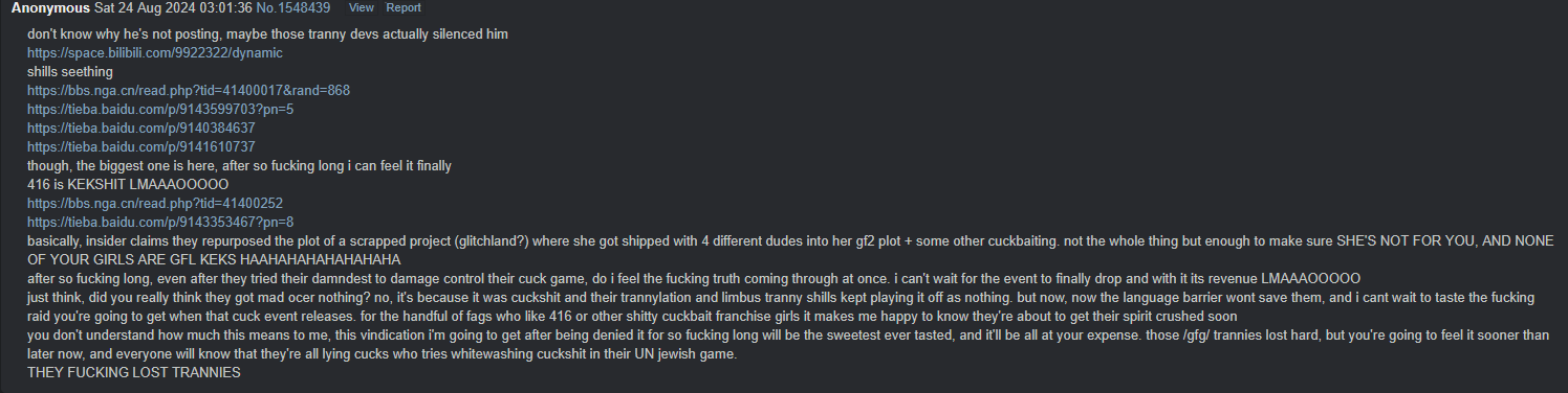 Previous: >>1919228Your source of the juiciest dramas about gacha games. Anything goes---your sentiment about the gacha industry, schizo takes, conspiracy theories, MTL screenshots from obscure Chinese forums, or just random gacha related topics that don't fit in a specific general.