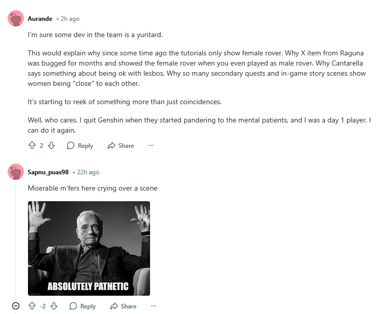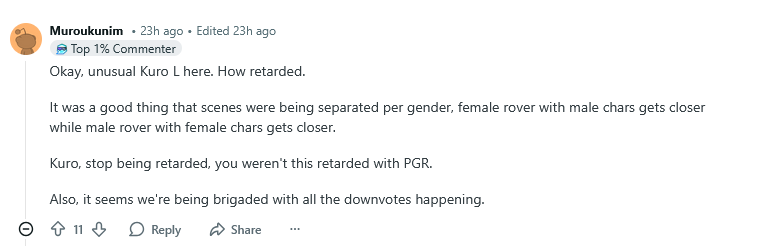 >At the same time, it is true that due to the structure and production schedule of the main story, we cannot fully reverse direction or apply major changes immediately all at once.>For that reason, Story Pack 21 will continue with the Master perspective as originally planned, while we conduct additional surveys and gather feedback to more clearly understand your actual immersion level and discomfort. We will use the feedback collected as a key reference when reviewing and adjusting the direction of the main story moving forward.The worst thing is that the game not only is getting censored but we might be losing the small victory we had with a self insert as the protagonist. They are literally pretending to be deaf in all the censorship criticisms and hyper focusing on the small shipfaggotry minority. This is getting worse and worse by the minute. Not to mention the additional censorship of Red Riding Hood Rou and B‑Rank Idol Seir. This is so fucking bad...