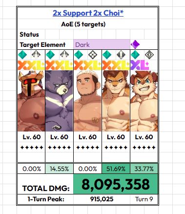 >>1927151Tyrantino can do double AoE team wipe while Code:B can dump nuke with defense buff twice. Fire can do double Covetous Wolf EX skills to cripple or wipe enemy team. Wood can do double Yuhyun EX with the buff from defense.Boss Ren's buff is honestly overkill for current content.