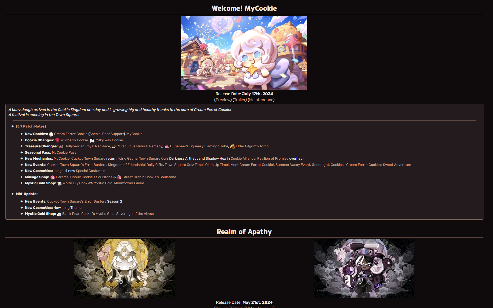 You want summa them Cookie Run Games? We gotchu. We got so many Cookie Run Games to discuss, and we're sure you're going to talk about EVERY. SINGLE. ONE. Right? Here's all the latest:Ovenbreak>Operation: Now Hiring - Get into the TBD and plant fondue C4 at the designated location!>Meet Dark Fondue Cookie - Disrespect her! Fight the system!>New Rewind Feature - Fix your mistakes in your runs! You didn't beat the game!>New costumes and jelly shapes!>Chestnut Cookie has somehow not noticed temporal rifts! What an idiot!>New Treasure -Twirling Timepiece! Get them points!>Meet PAIN De Campagne Cookie soon!Kingdom>Meet Dark Enchantress Cookie (New Witch Rarity [Unrelated to a Wicked™ Collab]) and Mold Dough Cookie (Epic)!>5th Anniversary Festival - Get sweet rewards at the Plaza with your special Guest, Fresh Apple Fairy Cookie!>Emblem of Darkness, Grand Darkness Pass, Path of the Absolute and Beast-Yeast events to get Dark Enchantress Cookie!>Star-Spire of Resonance - New Mode to upgrade and obtain cookies from certain elements!>New Legendary Costumes for Shadow Milk Cookie and Eternal Sugar Cookie - This is going off-script!>Guardian of the Rift is back - And harder than ever!>Bear Jelly Rush is here . new mini game mode to match-3 pies! - Where have we've seen this before?>Beast-Yeast Episode 13 Available - Being edged at the edge of light and darkness before the grand climax!Tower of Adventures>Meet Melanchream Cookie (Legendary) and Shallot Cookie (Epic) - New and strong dark type cookies very important to the plot!>Respective Legendary and Epic artifacts for both Cookies added - Invincible for a few seconds with the right combinations!>Abyss Raid Season 2 - Obtain Shallot Cookie's first costume by beating harder difficulties, or splurge in the costume gacha for her second one!>Reworks and Rebalancing for early adventure and story mode to make a smoother experience and give better rewards!