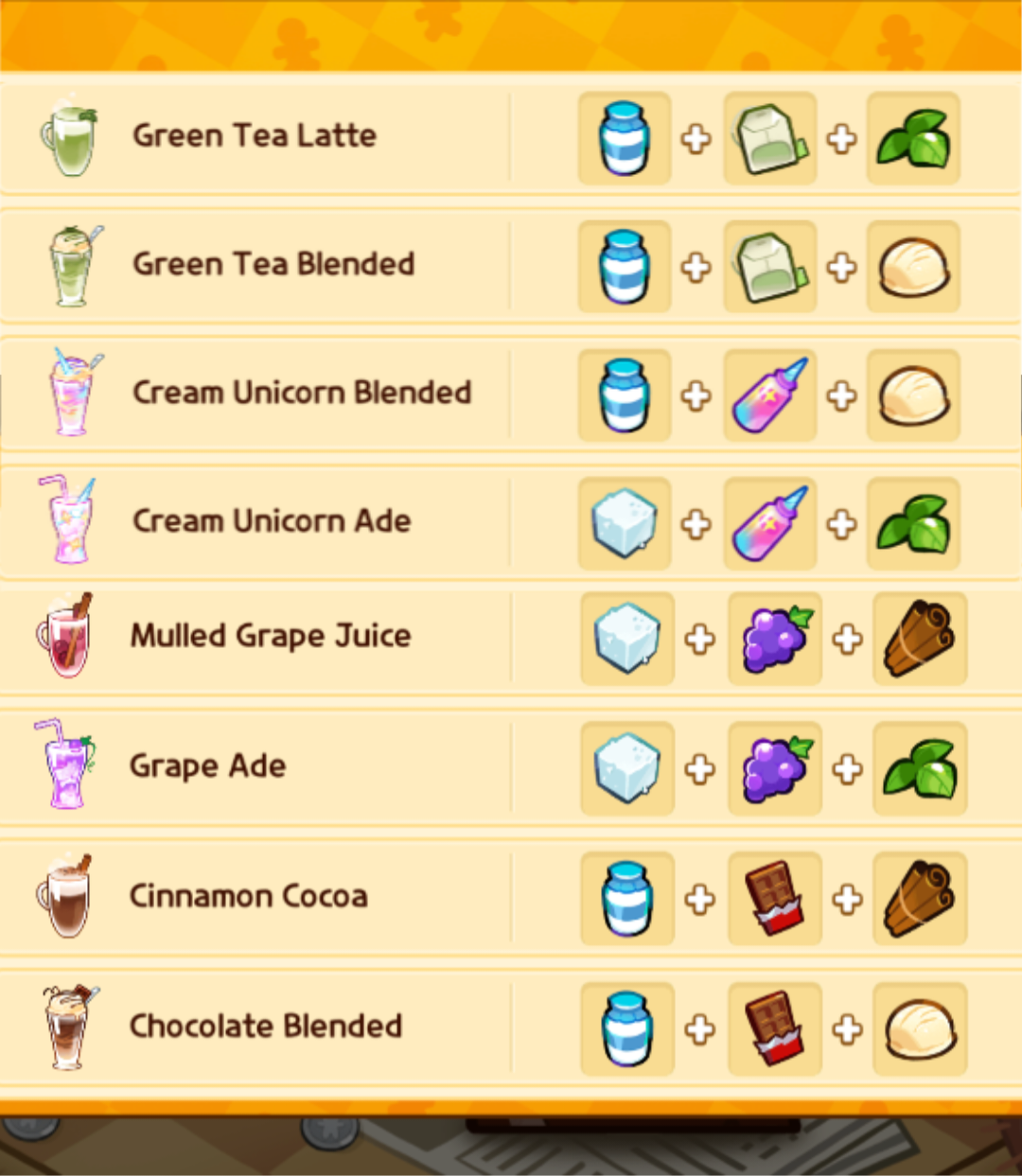 Well, sharing the ingredients and drinks featured in this Chestnut Cookie's Drink Stall minigame:>Green Tea LatteMilk + Green Tea Bags + Mint>Green Tea BlendedMilk + Green Tea Bags + Ice Cream >Cream Unicorn BlendedMilk + Cream Unicorn Extract + Ice Cream >Cream Unicorn AdeIce + Cream Unicorn Extract + Mint>Mulled Grape Juice Ice + Grapes + Cinnamon Sticks >Grape AdeIce + Grapes + Mint>Cinnamon CocoaMilk + Chocolate + Cinnamon Sticks >Chocolate BlendedMilk + Chocolate + Ice Cream