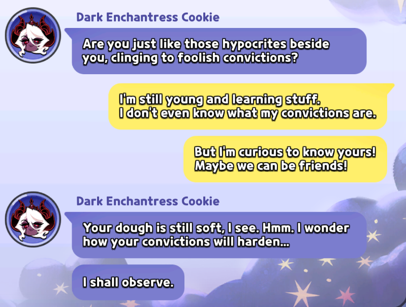 >>1950249Even though Timekeeper and Longan cookie are obviously more powerful than Dark Enchantress, Dark Enchantress feels more impressive in her feats. Think about it, she made a cake witch in the form of human. That's like recreating a creator diety.