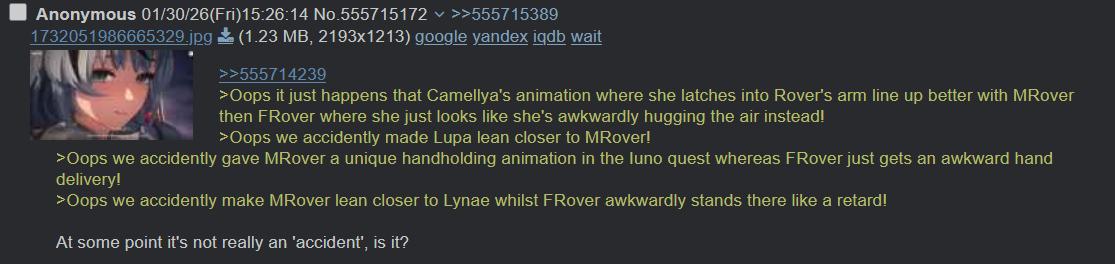 Cuckposters are trying really hard. Even Hoyo is sensible enough to separate shipcucks from pushing their agenda onto commissioned fanart, and you are telling me Kuro is shipping the main push girl that comes with a spending event with another male in the main story? retard