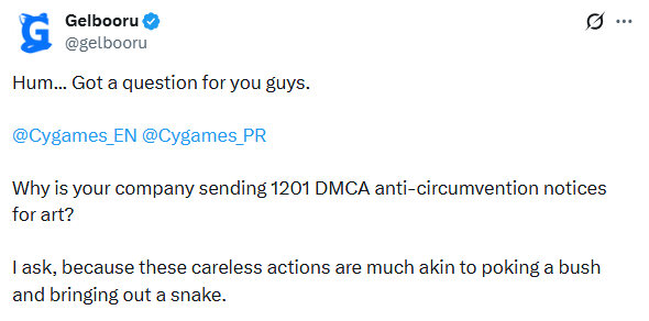 Cygames is currently sending DMCA notices to Gelbooru.