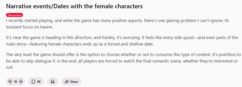 Cuck dust to rewrite the entire story and reframe it with the female heroine as the main character to erase the fact that they literally replaced the original BD self-insert with a brown dudeAlso, it seems that the majority of the playerbase is shippers that are okay with romance. As expected of game everyone calls cuck dust I guess.