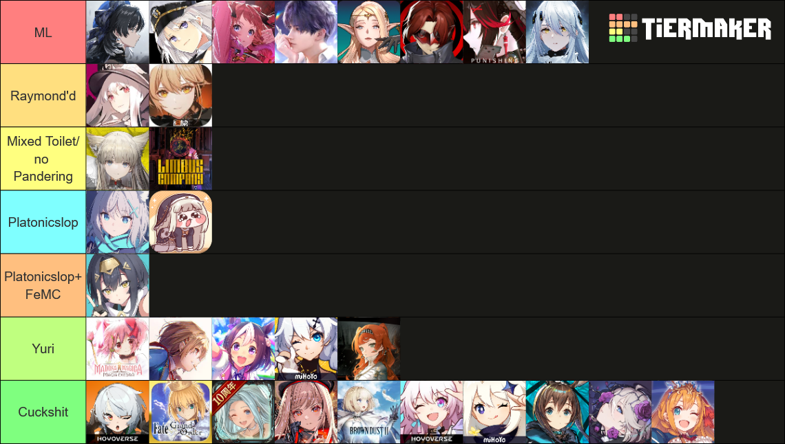 >>1956453>Yuri doesnt count as ml because its gay but pgr and wuwa having men thag are for (you) counts as ml>Endfield doesnt have shipshit and has plenty of pandering but it counts as mixed toilet despite pgr and wuwa bejng mixed toilets too>trickcal is platonic (?)I dont care/know enough about the rest