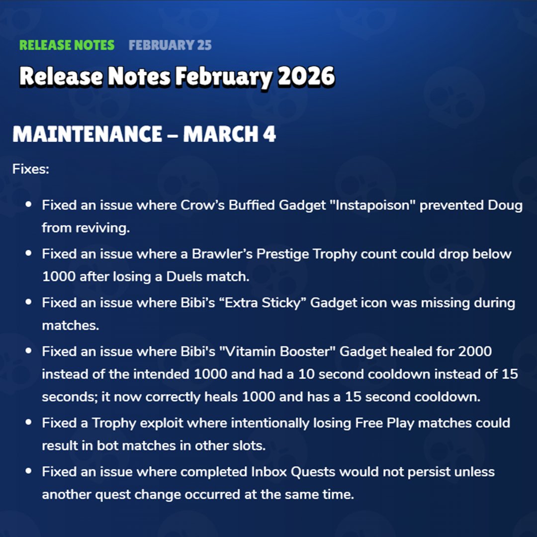 Maintenance tomorrow. No balance changes I think, but at least they're fixing the broken bibi gadget.