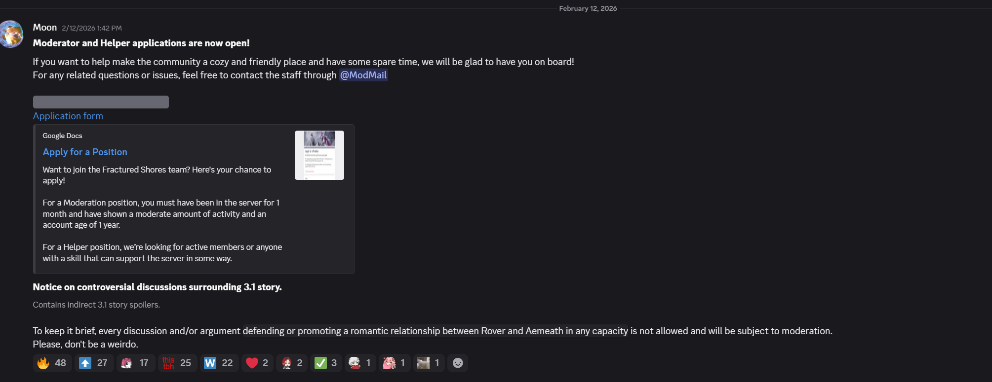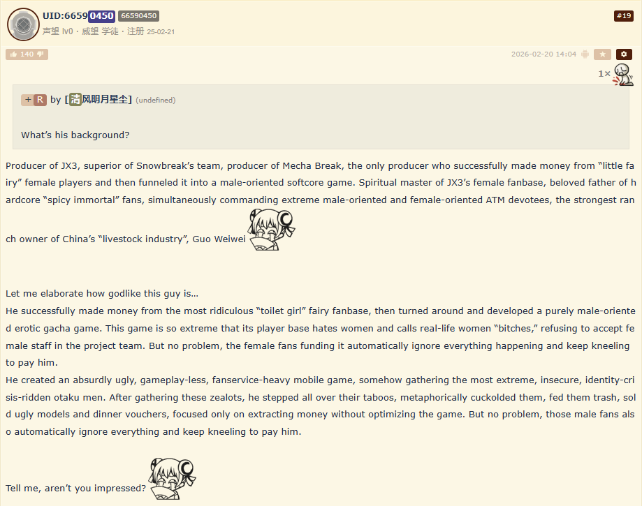 >>1959075>west normalfaggots are trying to deny the wife aemeath factionThis is also happening in china community btw and the daughter faction is more vocal>in china bilibili videos about their life together as spouses reach hundred of thousands of views every dayTrue. However, that means the wife faction can only rely on fan videos. Kuro KNOWS those kind of fan videos are popular, but they still REFUSE to cater to wife factions. They REFUSE to have Aemeath on valentine official art.The wife faction in china actually read and translated one of Gacha Grail members post to their community. They know that Gacha Grail is one of the most vocal wife faction in global. CN reaction? They feel bad for wife faction in global because they are fighting a losing battle. In china, "Half dead Kuro is good Kuro". Only when Kuro needs money they will cater to wife faction.